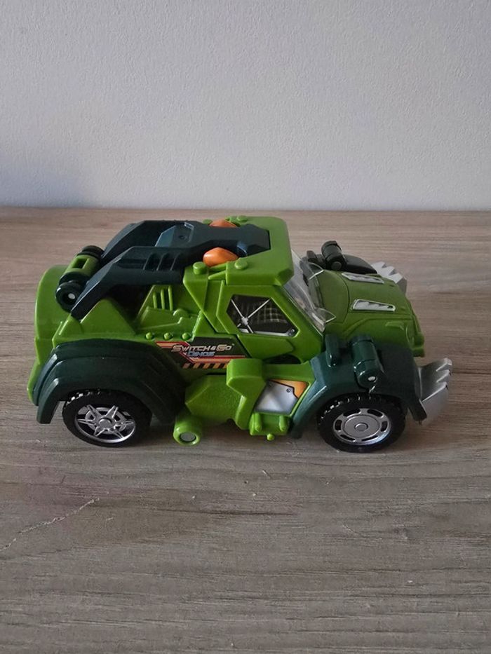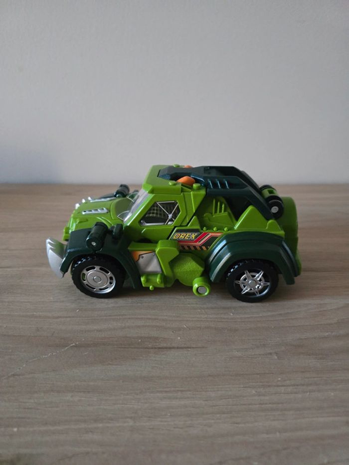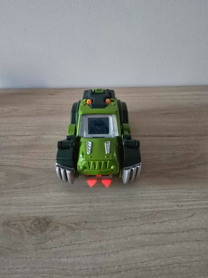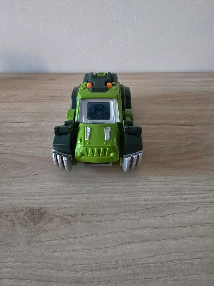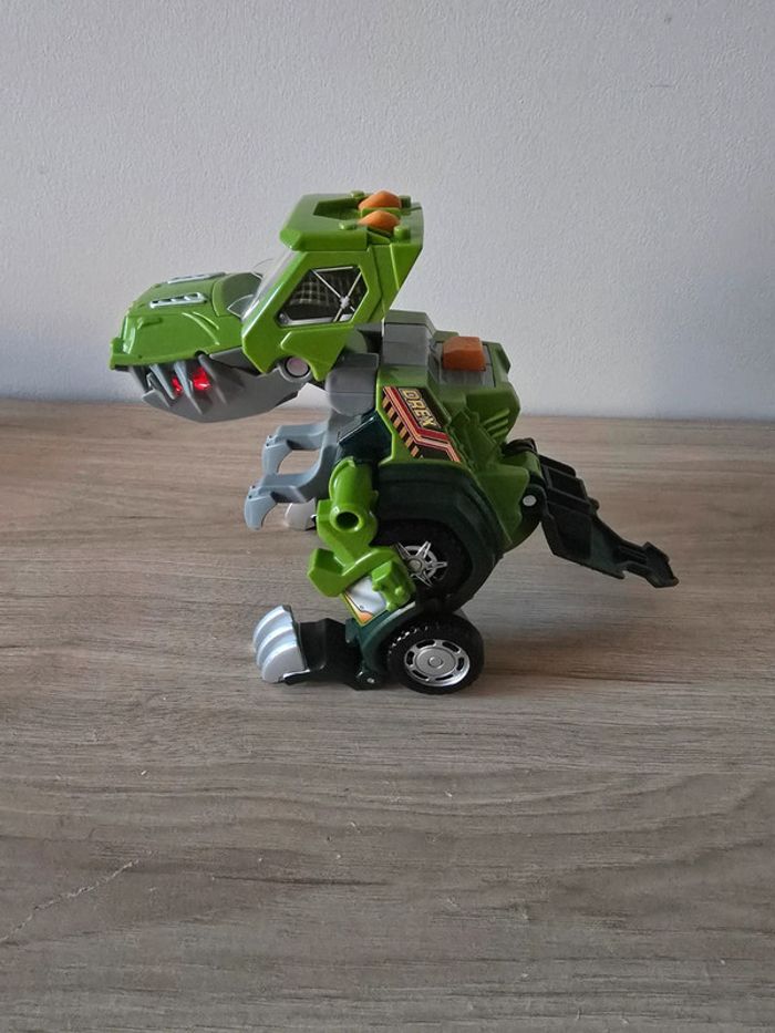 Dino Switch and go Drex super T-Rex Vtech En très bon état général et parfait etat de fonctionnement. Un T-Rex à transformer en Jeep tout terrain ! Deux modes : mode Véhicule et mode Dino. Chaque mode se déclenche automatiquement lorsque la transformation est effectuée. Ecran LCD avec animations : pilote pour le mode voiture et yeux de dino pour le mode dinosaure. Boutons pour déclencher les phrases et les effets sonores. En mode Dino, le bouton "Action" permet de faire bouger les pattes et ouvrir la mâchoire et active un effet lumineux dans la gueule du dino qui s'éclaire quand il ouvre la mâchoire. Avec des sons réalistes, des phrases liées à l’univers des dinos et des effets lumineux. Plus de 60 phrases et effets sonores réalistes. Arrêt automatique. Pile de démonstration fournie