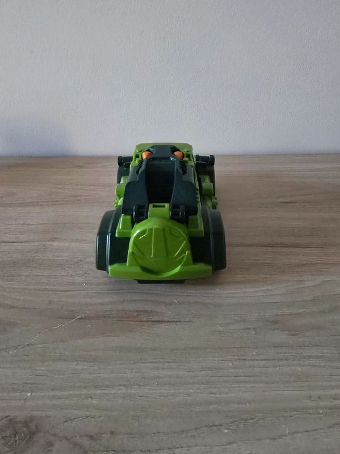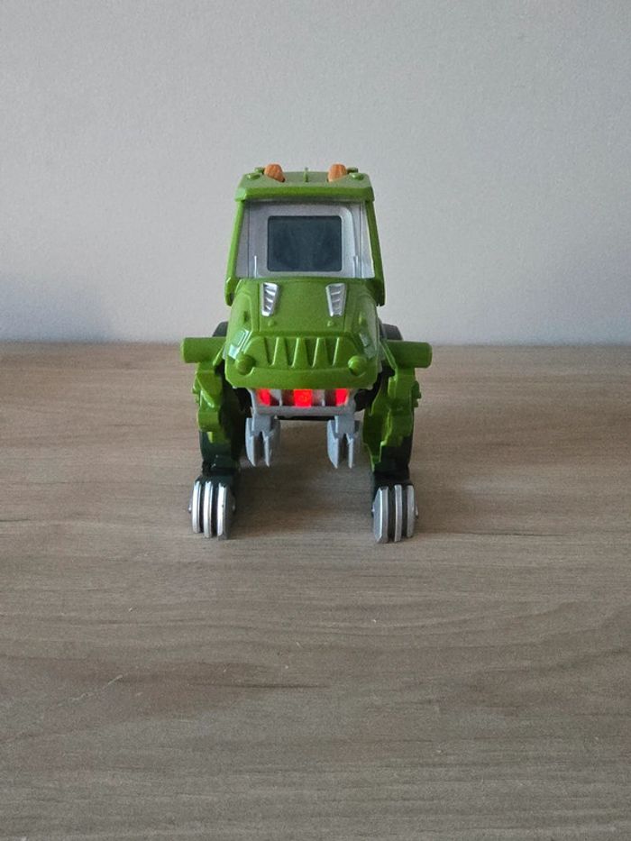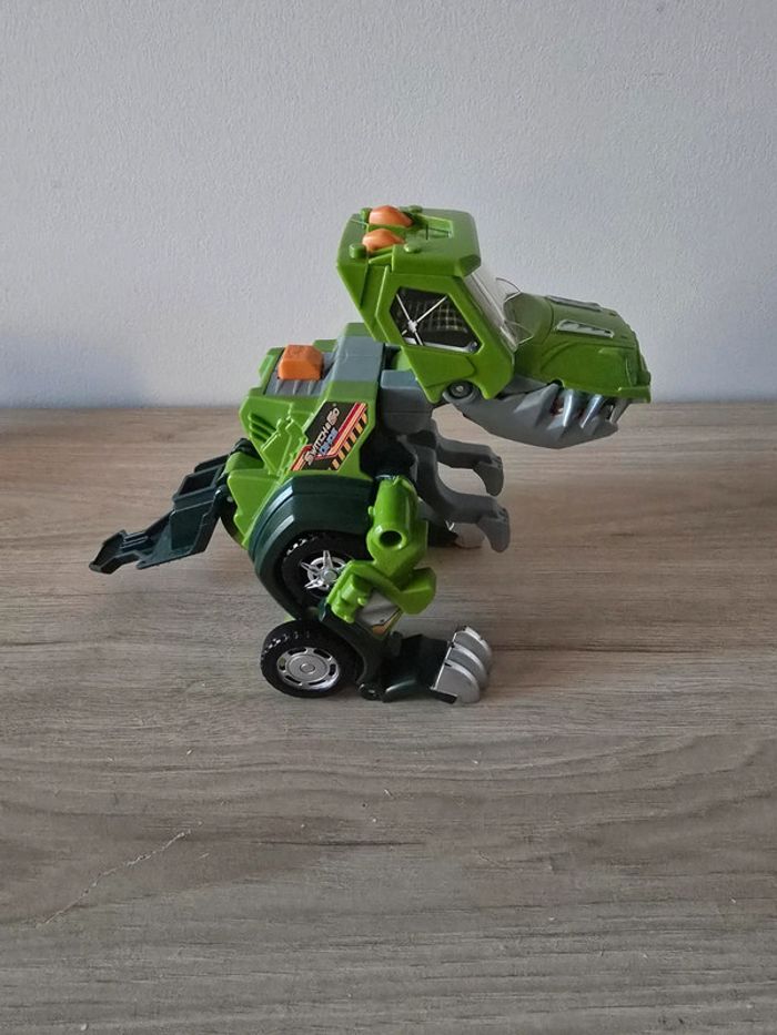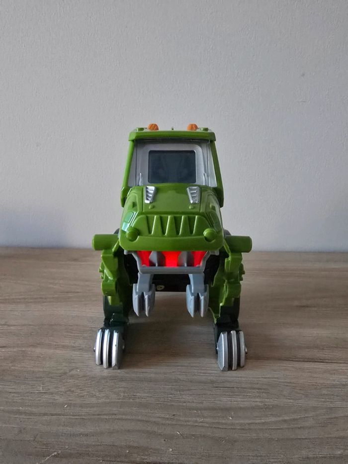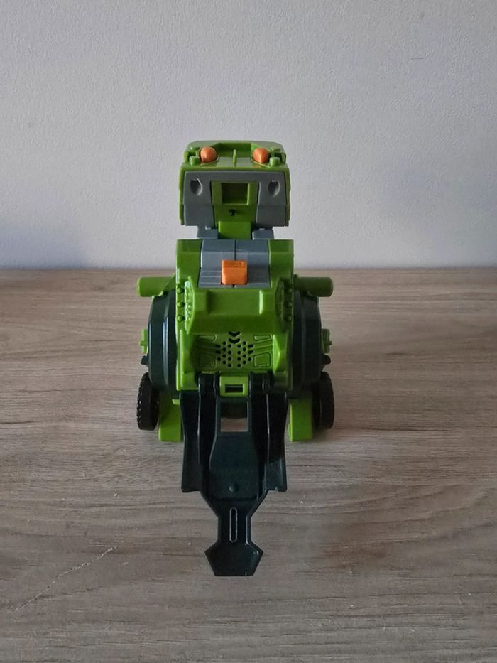Dino Switch and go Drex super T-Rex Vtech En très bon état général et parfait etat de fonctionnement. Un T-Rex à transformer en Jeep tout terrain ! Deux modes : mode Véhicule et mode Dino. Chaque mode se déclenche automatiquement lorsque la transformation est effectuée. Ecran LCD avec animations : pilote pour le mode voiture et yeux de dino pour le mode dinosaure. Boutons pour déclencher les phrases et les effets sonores. En mode Dino, le bouton "Action" permet de faire bouger les pattes et ouvrir la mâchoire et active un effet lumineux dans la gueule du dino qui s'éclaire quand il ouvre la mâchoire. Avec des sons réalistes, des phrases liées à l’univers des dinos et des effets lumineux. Plus de 60 phrases et effets sonores réalistes. Arrêt automatique. Pile de démonstration fournie