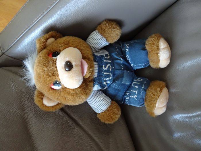 Peluche ours en salopette jean, il parlait mais le boitier des piles ne s'ouvre plus. 34 cm de hauteur.
