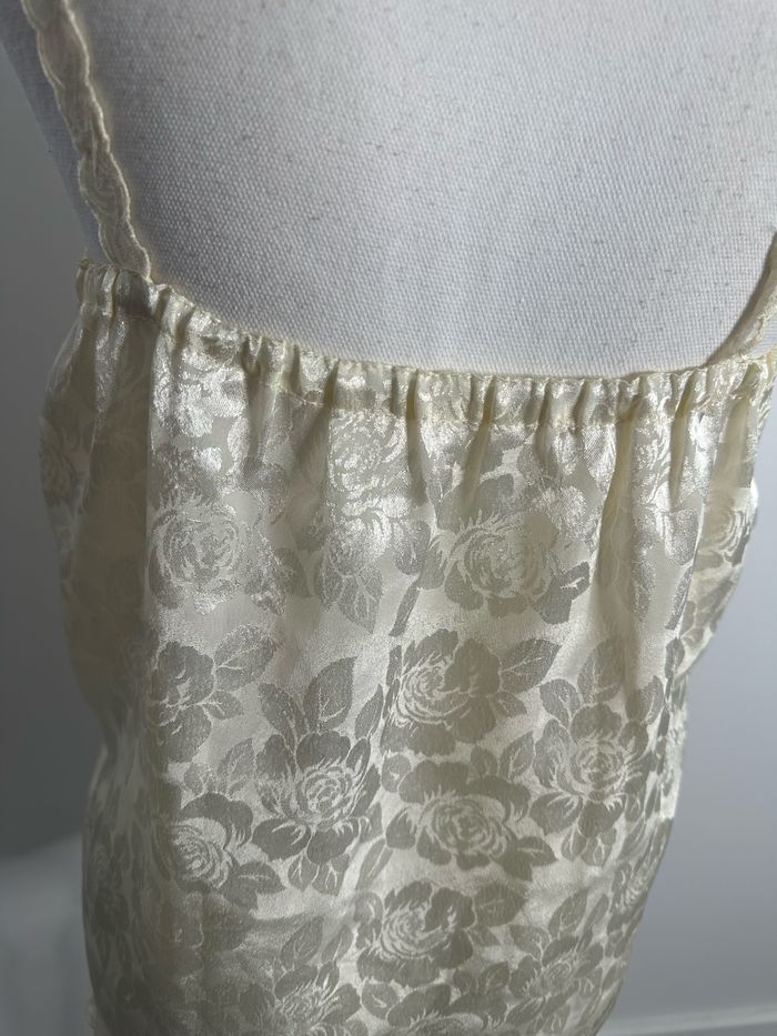 Débardeur - Excellent état - Taille 38 équivalent M - Blanc crème - Broderies dentelle - Tissus satiné - Détails ajourée au niveau du décolleté - Détails fleurs - Bretelle et bas feston - Élastique dans le dos - Vintage, années 80’ - Pas d’étiquette de taille ni de matière - À porter en débardeur, par dessus un pull ou en pyjama Dimensions: - 40 à 50cm niveau aisselles - 66cm de long