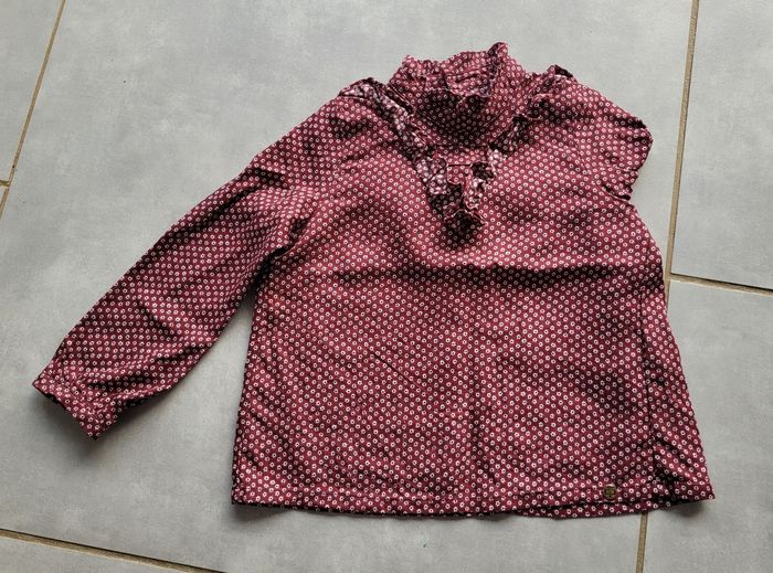 Blouse fluide, de couleur bordeaux avec petites fleurs, froncé à l'encolure, fermeture par boutons dans la nuque, de la marque Ikks, taille 4 ans (102 cm), en très bon état. Article lavé pour la vente.