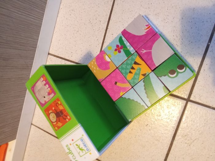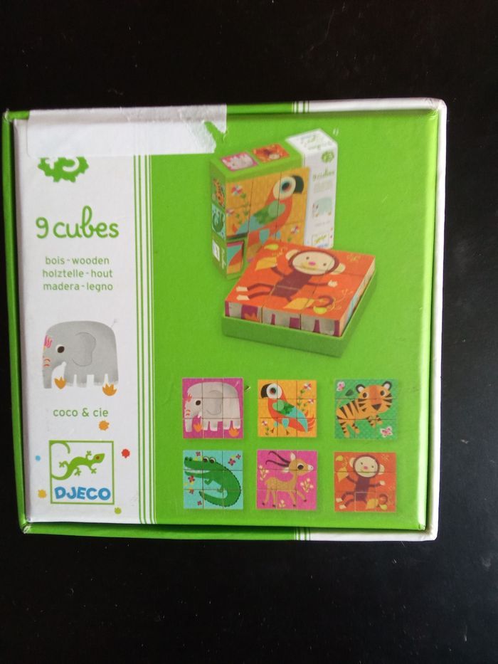 Boîte contenant 9 cubes en bois , permet de reconstituer 6 puzzles différents. Boîte d'origine, marque Djeco. Dès 3 ans De nombreux autres jeux, puzzles Djeco également à vendre ds mon dressing et réduction activée