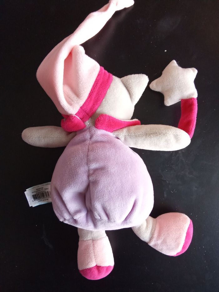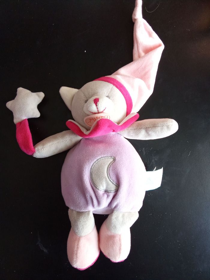 Très joli doudou chat tenant une étoile, une lune brodé sur le ventre, 2 étiquettes présentes. Bon etat général. Beaucoup d'autres doudous mm marque également à vendre ds mon dressing et réduction activée