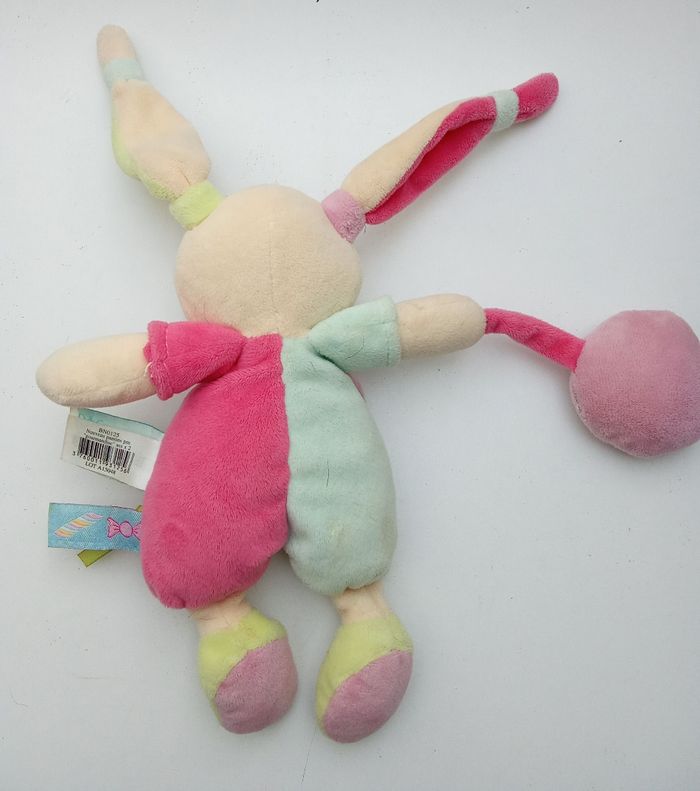 Doudou chien ou lapin marque babynat' couleur pastel, bruit papier froissé au niveau du col, tient un rond qui crispe également. 4 étiquettes présentes. Bon etat général. Beaucoup d'autres doudous mm marque également à vendre ds mon dressing et réduction activée