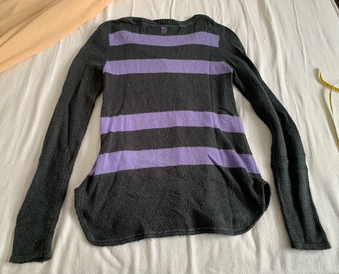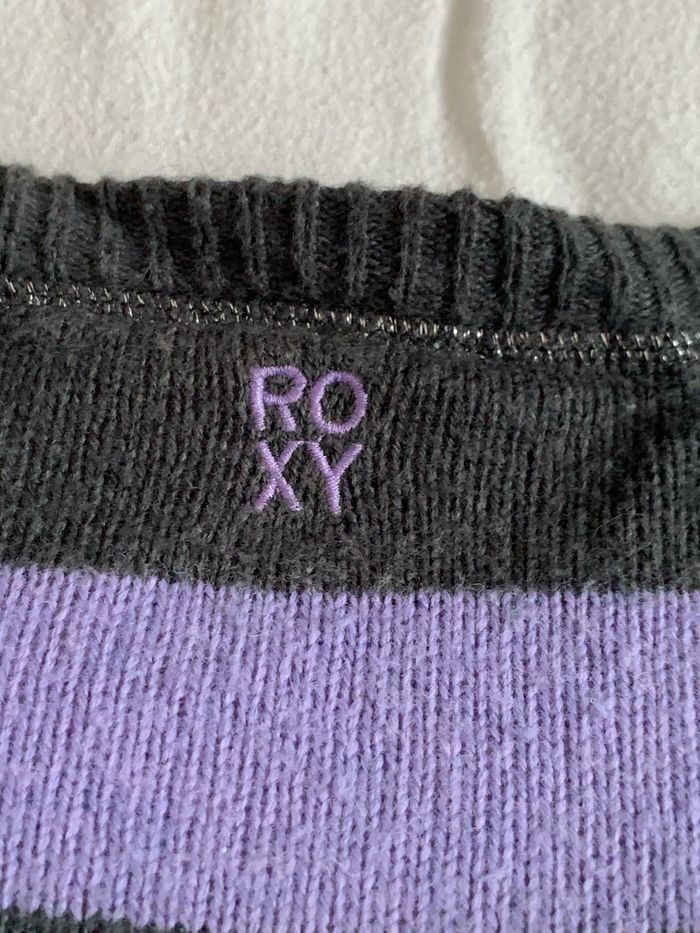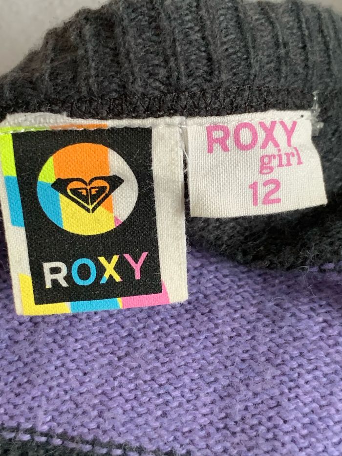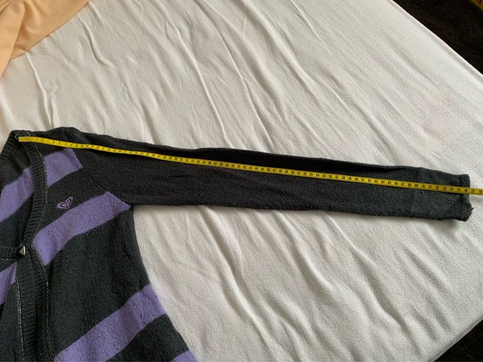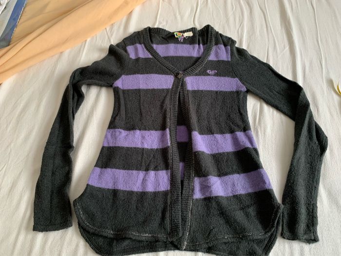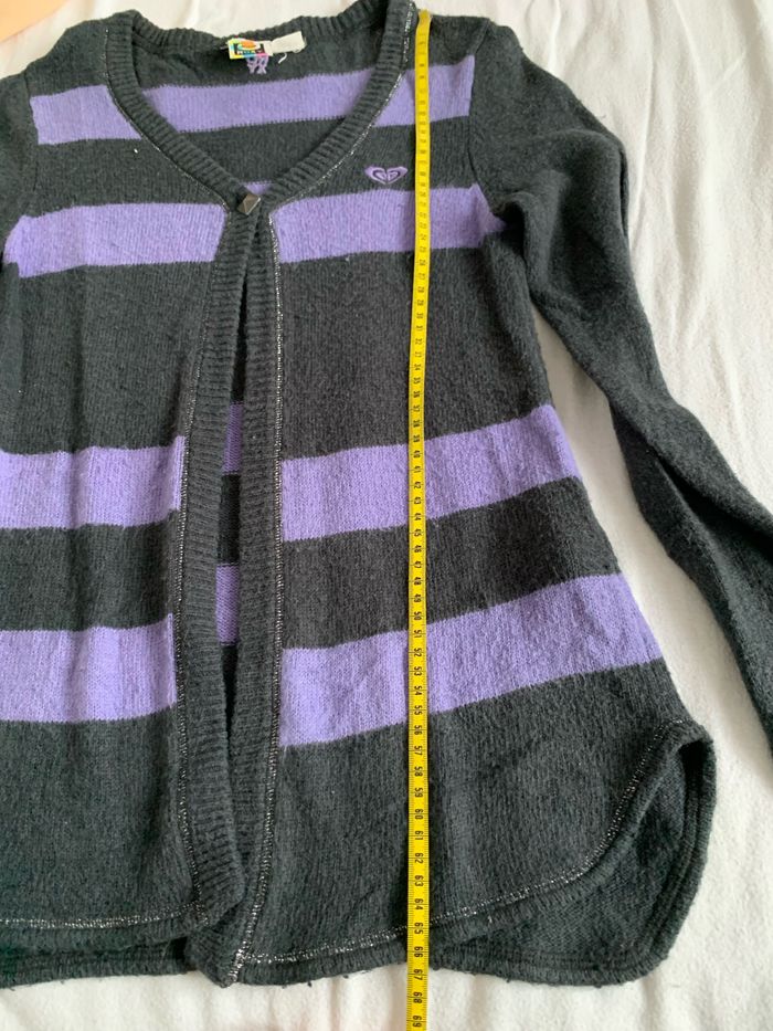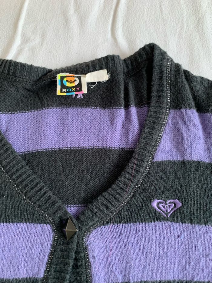 Gilet Roxy rayé gris et violet avec le contour brillant, gilet se fermant avec 1 bouton, gilet chaud, taille 12 ans
