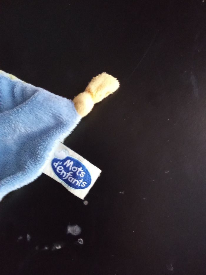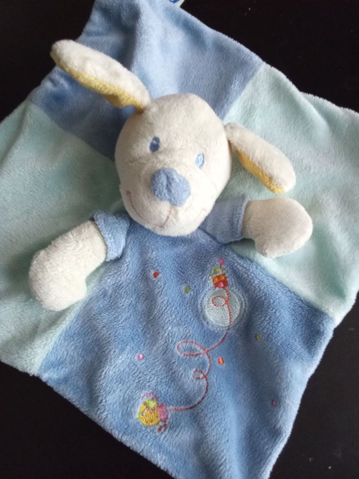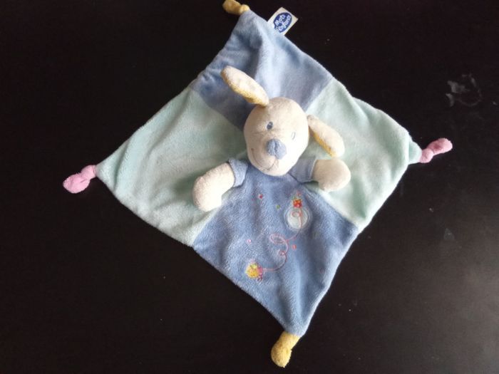 Doudou mouchoir bébé garçon bleu à tête de chien, marque mot d'enfants de chez Leclerc, 2 étiquettes présentes. bon état général. Beaucoup d'autres doudous mm marque également à vendre ds mon dressing et réduction activée