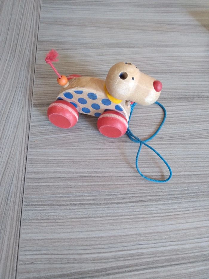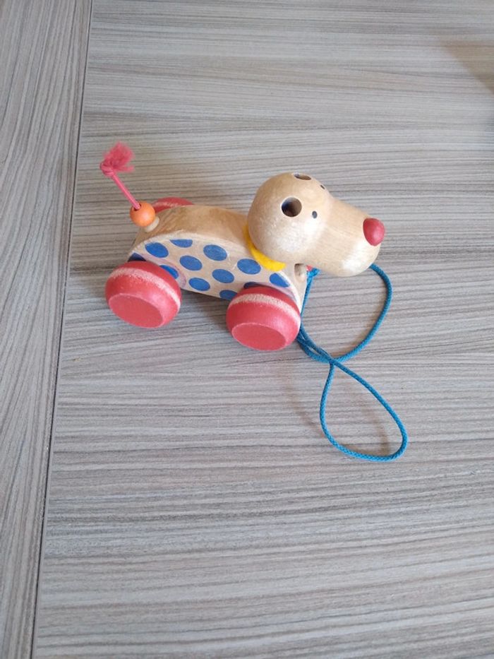 Chien en bois avec laisse , éveil des enfants . A déjà servi mais peu encore servir .
