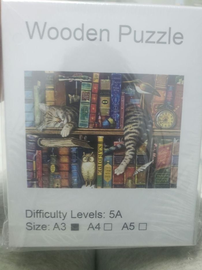 Neuf . Puzzle en bois de chat dans une bibliothèque. Niveau de difficulté : 5A Challenger Taille: A3