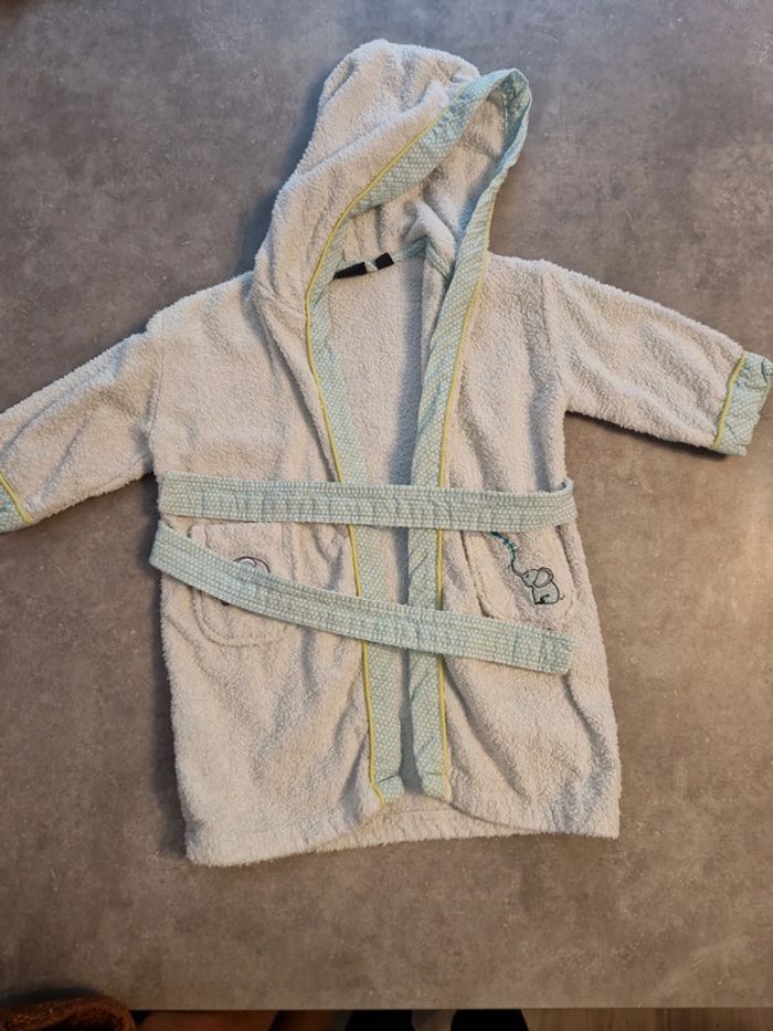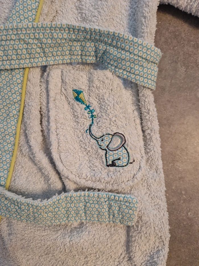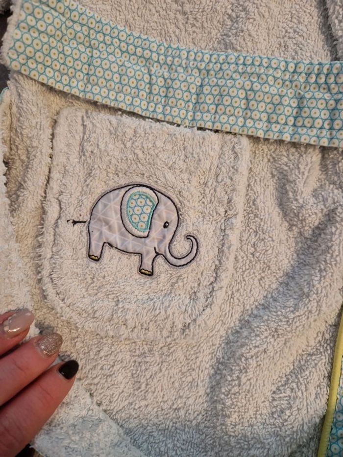 Peignoir de bain garçon avec capuche blanc vert motifs éléphants T2ans 100% coton TBE carré blanc