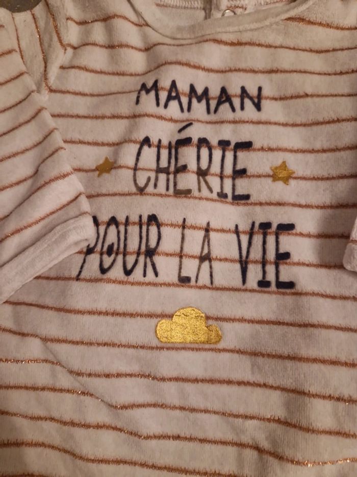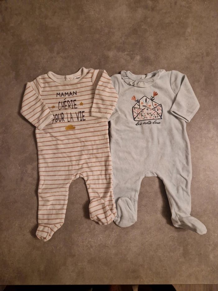 Lot de 2 grenouillères 1 pièce en velours bébé fille. En très bon état ( une écriture un peu effacée voir photos)