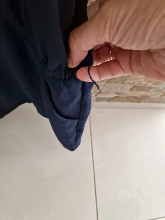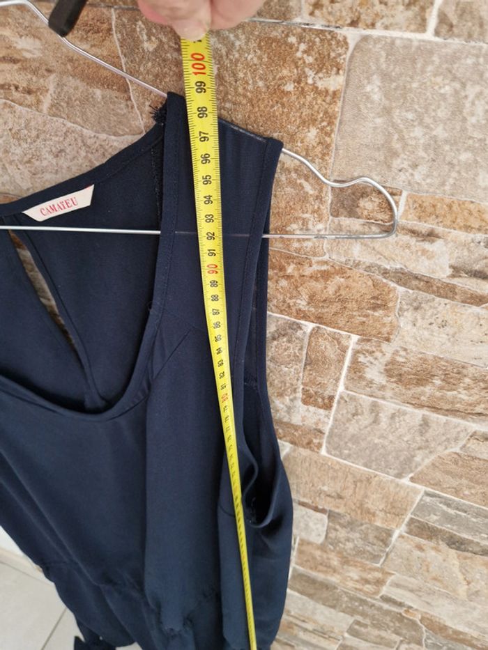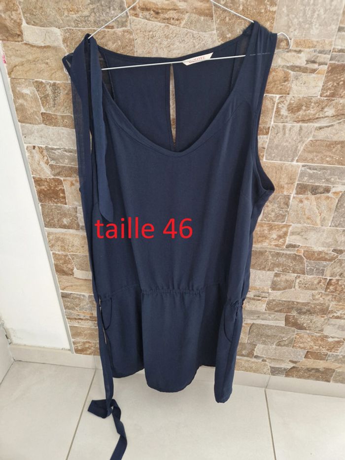 1 robe couleur bleu marine marque camaieu taille 46 transparent vers les epaules 1 boutons ds le dos 2 poches 1 fil a reprendre sur le coté pour mettre la ceinture (voir photo) 100% polyester 48cm sous l'aisselle jusqu'en bas 54 cm largeur entre les 2 aisselles 99cm env taille haut jusqu'en bas #laetie69_femmesTAILLE46
