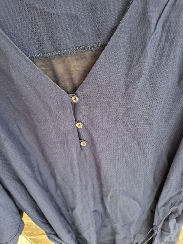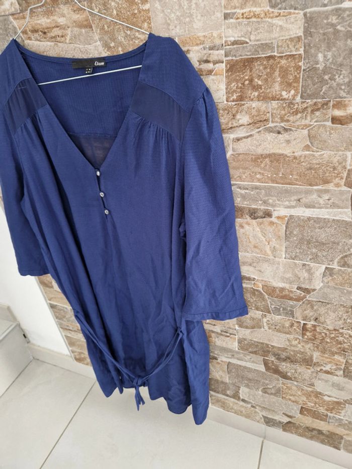 1 robe couleur bleu marque etam taille 46 ceinture au milieu 3 boutons devant, transparent vers les épaules et le haut du dos 100% viscose 66 cm sous l'aisselle jusqu'en bas 60 cm de large aiselle a aisselle 90 cm env taille du haut jusqu'en bas #laetie69_femmesTAILLE46