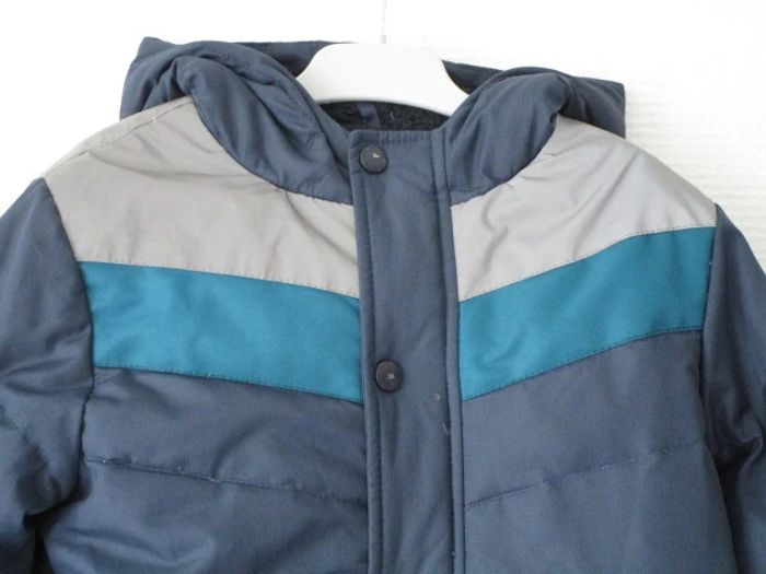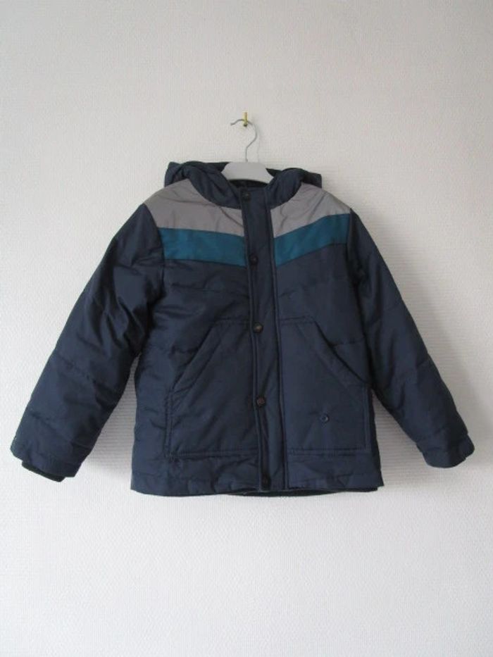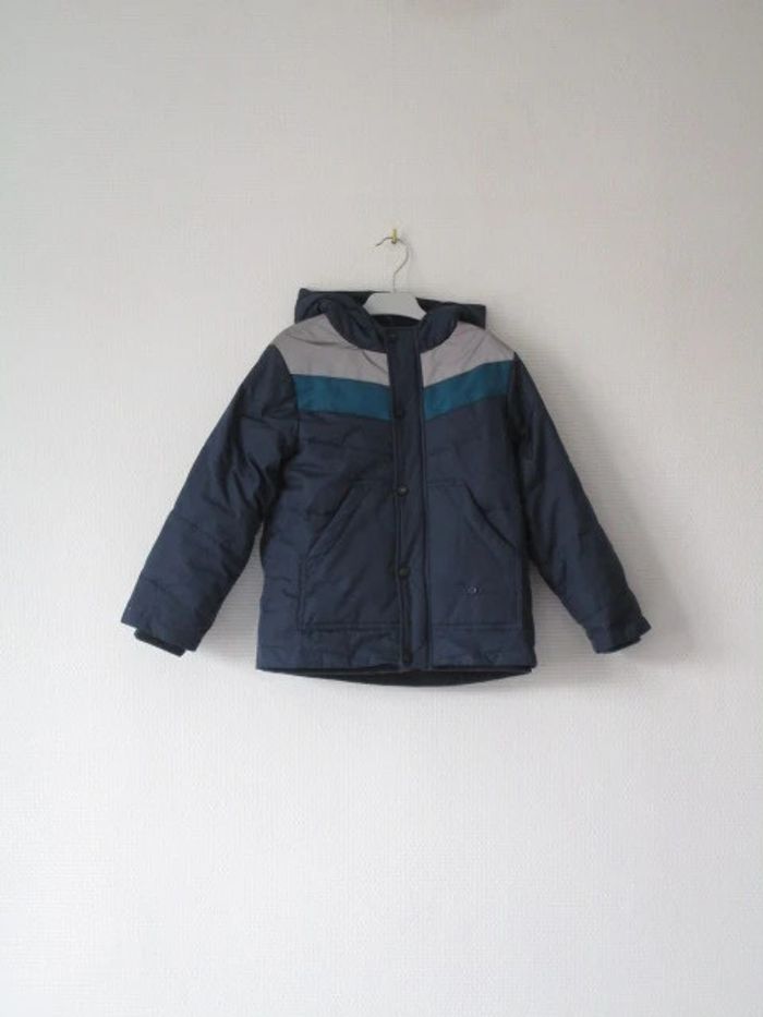 Blouson bleu marine de marque Vertbaudet taille 6 ans Capuche Ultra-chaud Intérieur polaire et rembourrage duvet Plus d'étiquette de composition Grande bande réfléchissante dans le haut suivie d'une bande verte En très bon état général, juste un petit accro qui a été caché par un bouton sur poche avant gauche (cf photos) #mamanbrade59garçon6ans