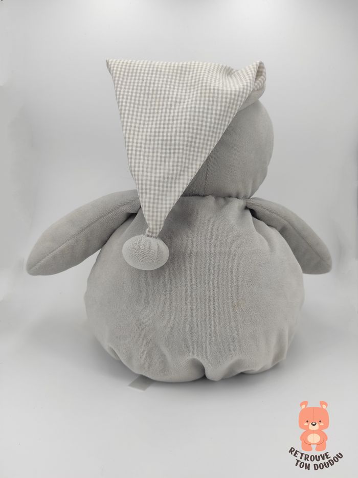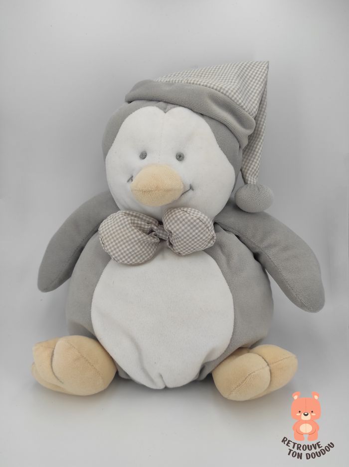 🐧 Doudou Boule Pingouin gris et blanc avec bonnet de nuit et hochet, Priscilla Larsen