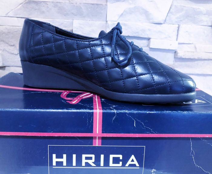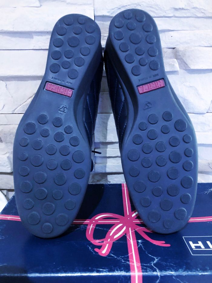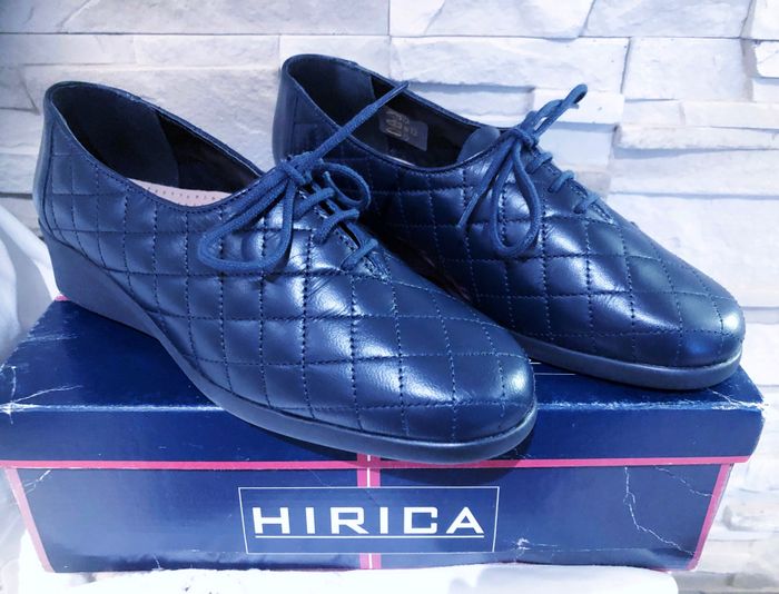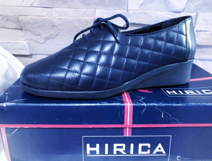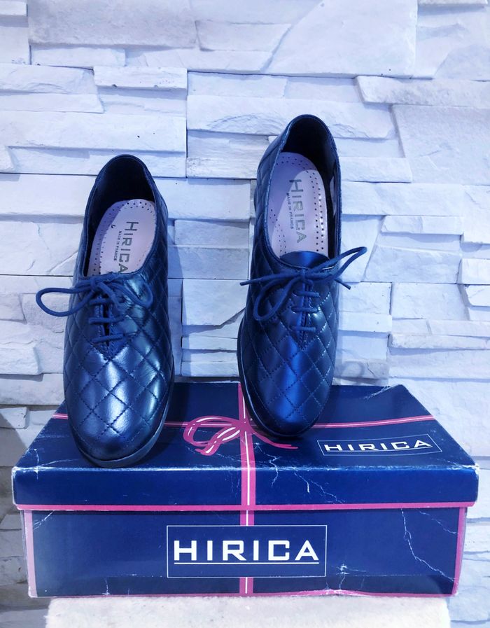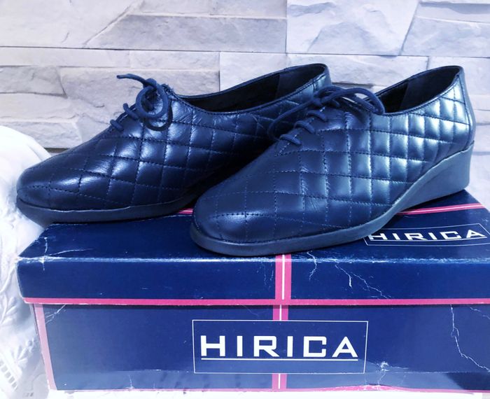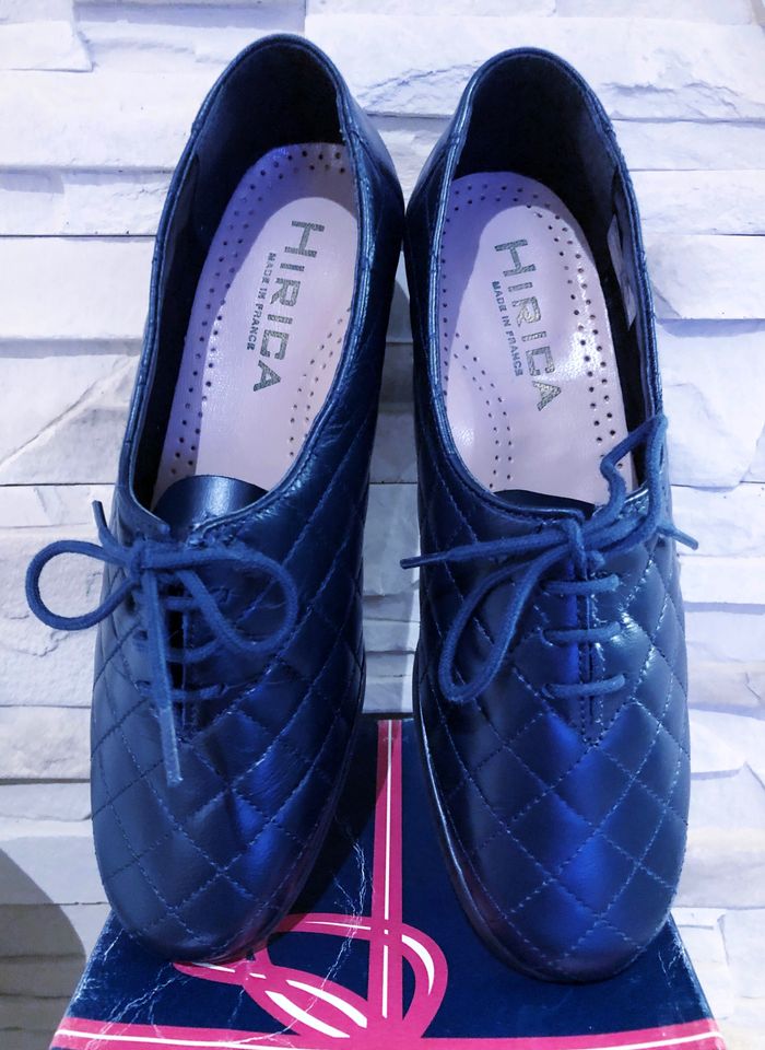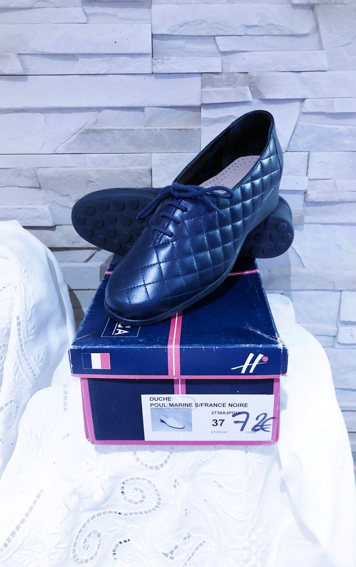 N.B : Acheté 72,00 € pour maman mais ne convient pas. MARQUE : HIRICA... ÉTAT* : NEUF AVEC BOITE D'ORIGINE !!! *Seul la boite est abîmée (Voir Photos) POINTURE : 37 HAUTEUR DE TALON : 3,5 CM MADE IN FRANCE COLORIS : BLEU MARINE MATIÈRE : CUIR MOTIF : VISUEL MATELASSÉ* *Losanges PARTICULARITÉS : - Spécial Pieds Sensibles ou Délicats - Très grand Confort - Aspect Visuel Matelassé - Semelles Antidérapantes - Surpiqûres Apparentes