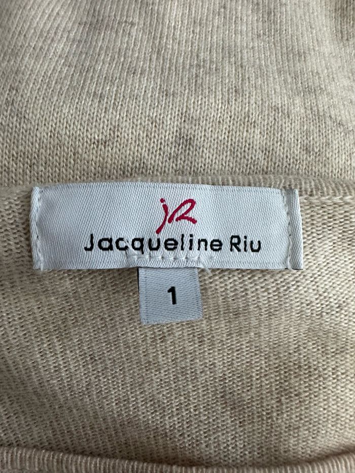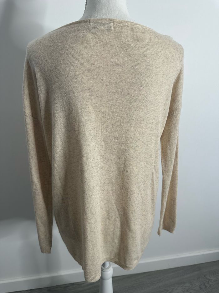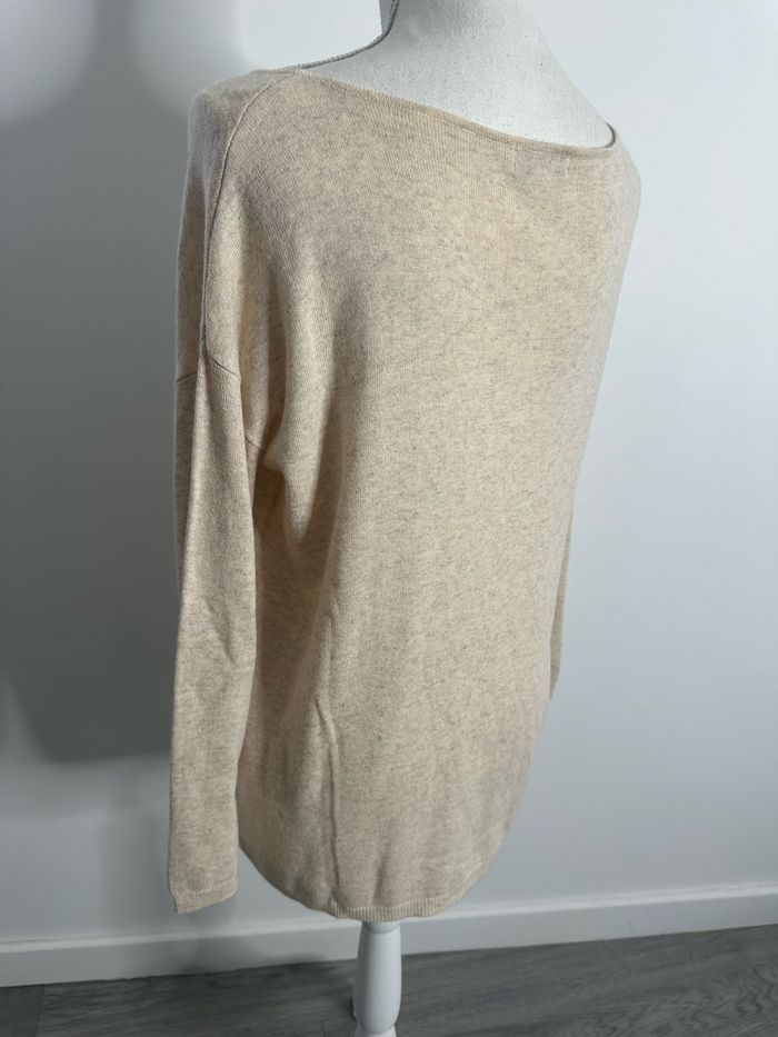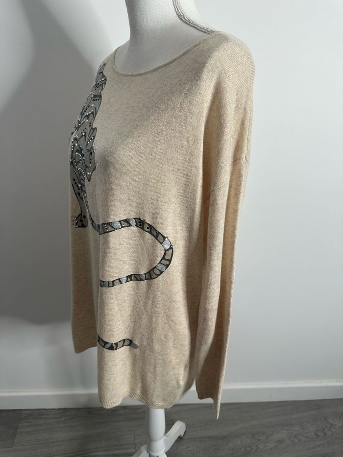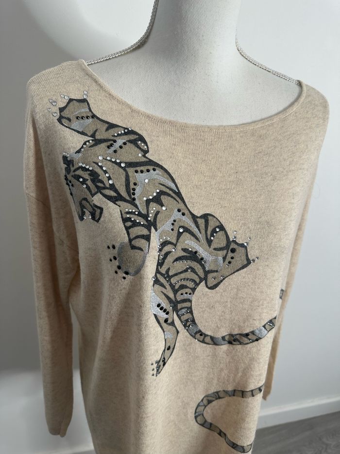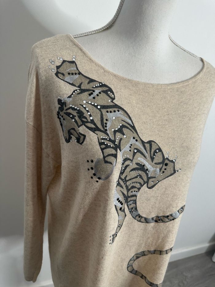 Pull - Excellent état - Taille 1 équivalent 36 S - Jacqueline Riu - Coupe oversize - Beige crème - Col large - Imprimé tigre - Strass noirs et argentés - Viscose, polyester, polyamide, angora Dimensions: - 59cm niveau aisselles - 72cm de long