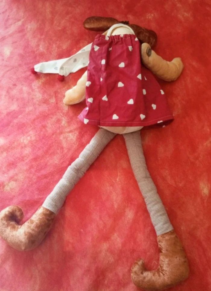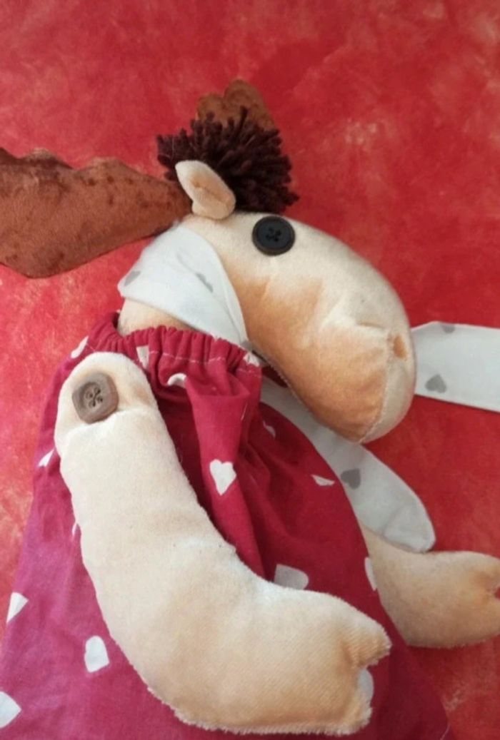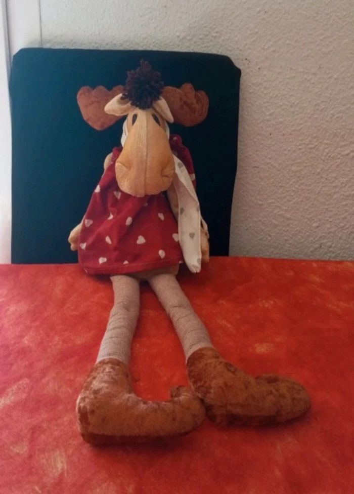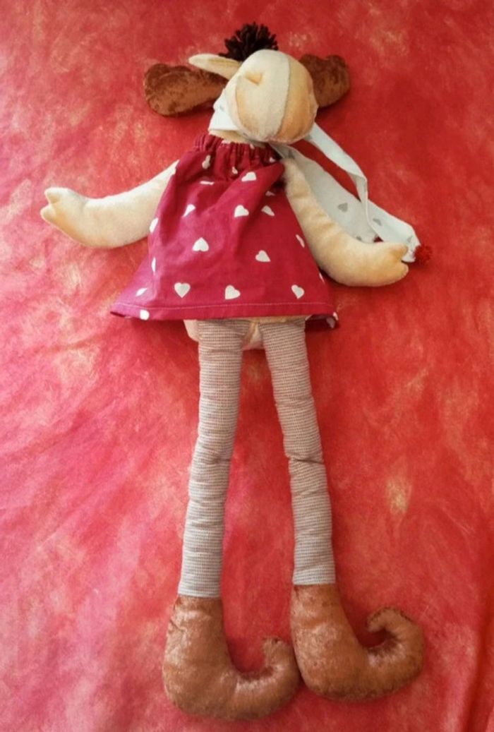 Jolie peluches élan cerfs avec robe rouge avec des coeurs, sympa pour décorer une chambre d'enfant,je ne sais pas si c'est du fait main, il n'y a pas d'étiquette. Très bon état, présence d'une tâche sur l'écharpe ( j'ai pas essayé de faire partir) et une patte est décousue, voir les 2 dernières photos. Dans mon dressing, il y a d'autres peluches , des figurines, des Barbie, des Petshop, des Lego Duplo, des Playmobil, des Barbie et beaucoup de jeux et jouets vintage