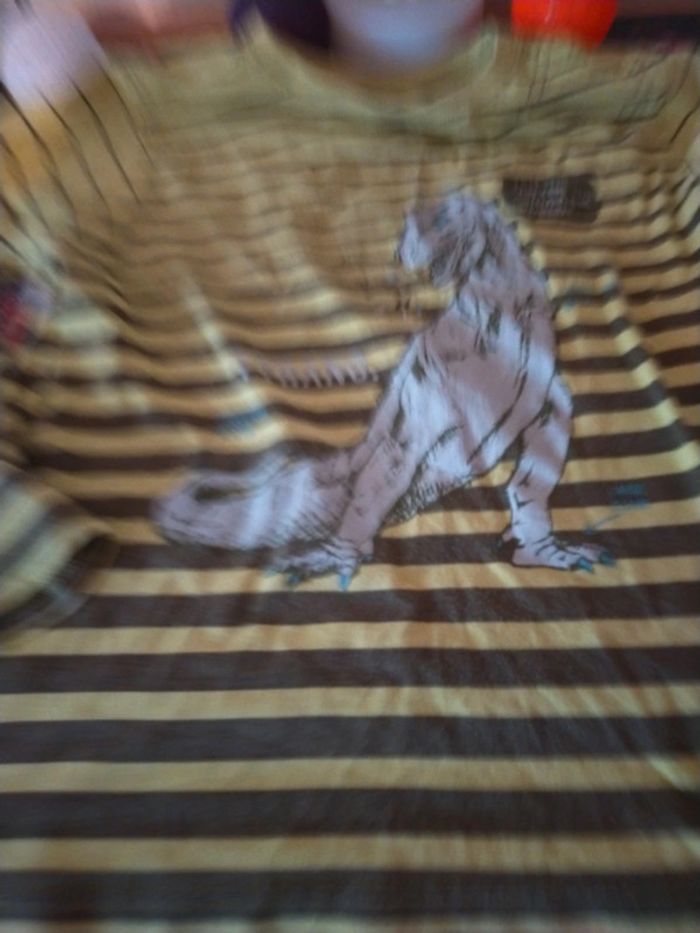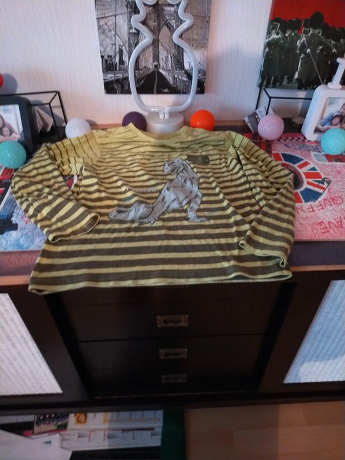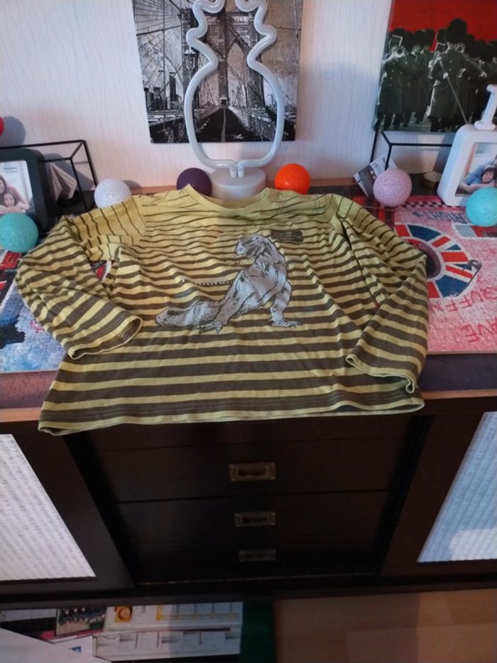 Je vends mon tee-shirt manches longues très sympa avec motif dinosaure, longueur du tee -shirt est de 46 cm de long et largeur est de 39 cm