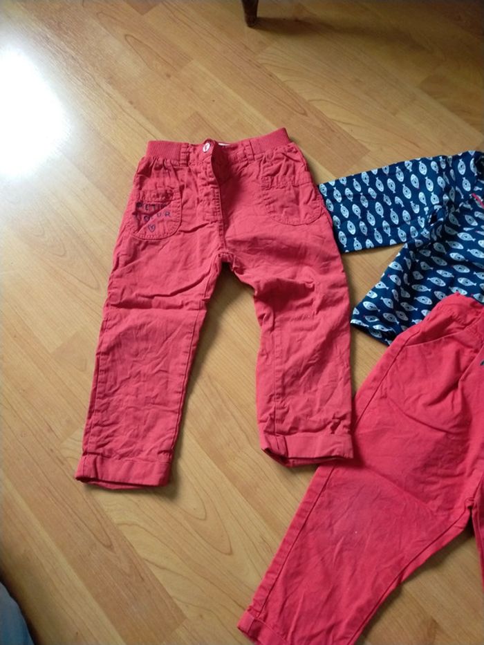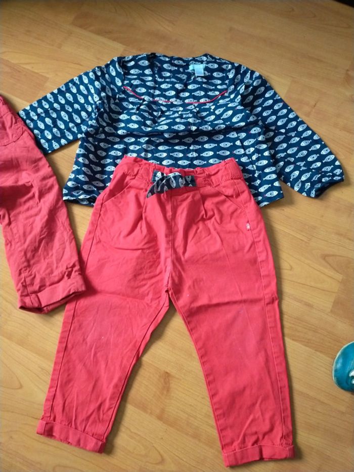 Blouse marine motif poisson et son pantalon rouge assorti. J'avoue un pantalon qui va bien dans les couleurs de marque dpam