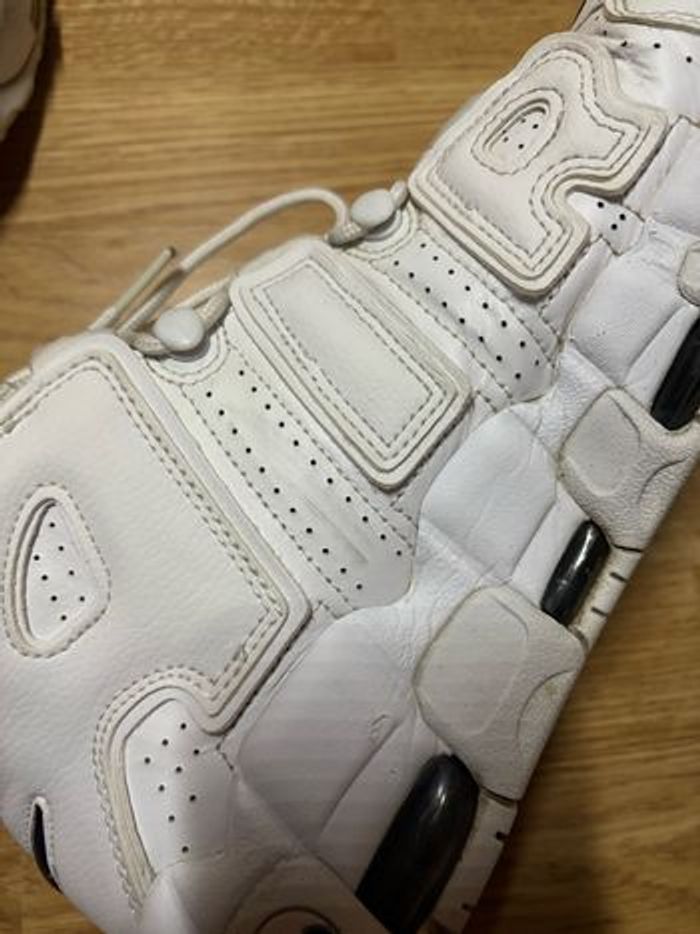 Nom: Nike air more uptempo blanche avec logo bleu Taille: 43 État: très bon état Boîte : sans boîte Imperfections : comme sur les photos un trait noir sur le blanc Trop grande pour moi Envoie: rapide et soigner Envoie: le jour même voir le lendemain Je n’accepte pas les retour je ne suis pas un magasin.