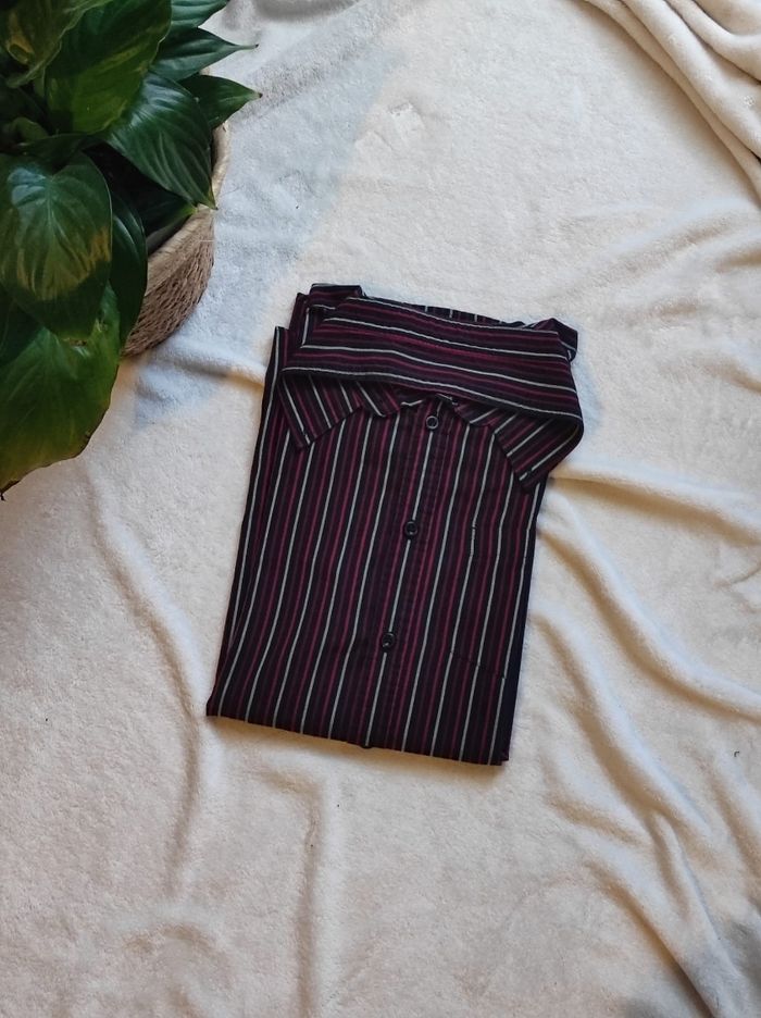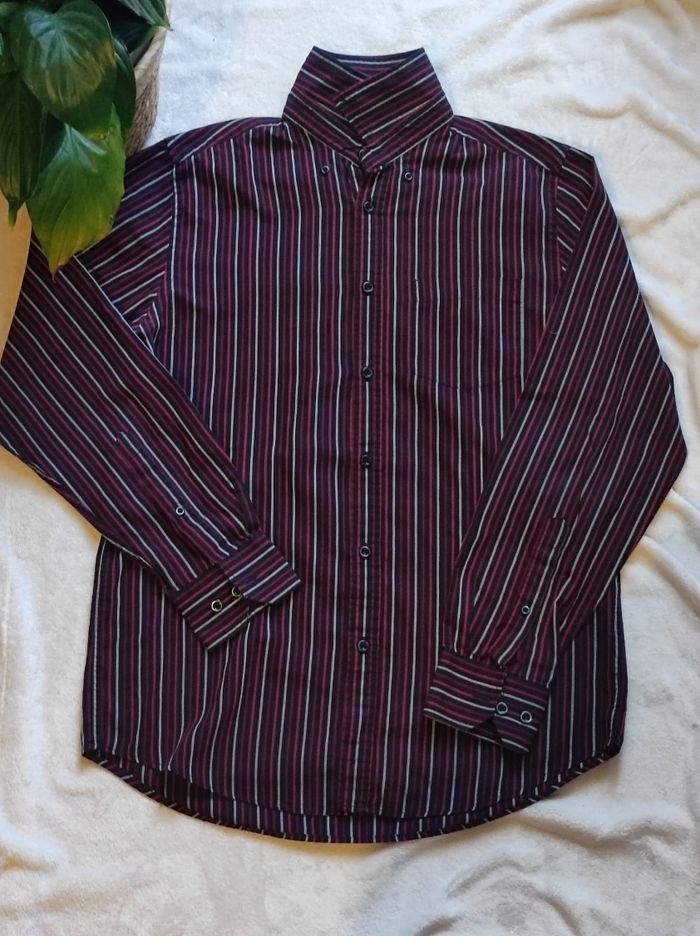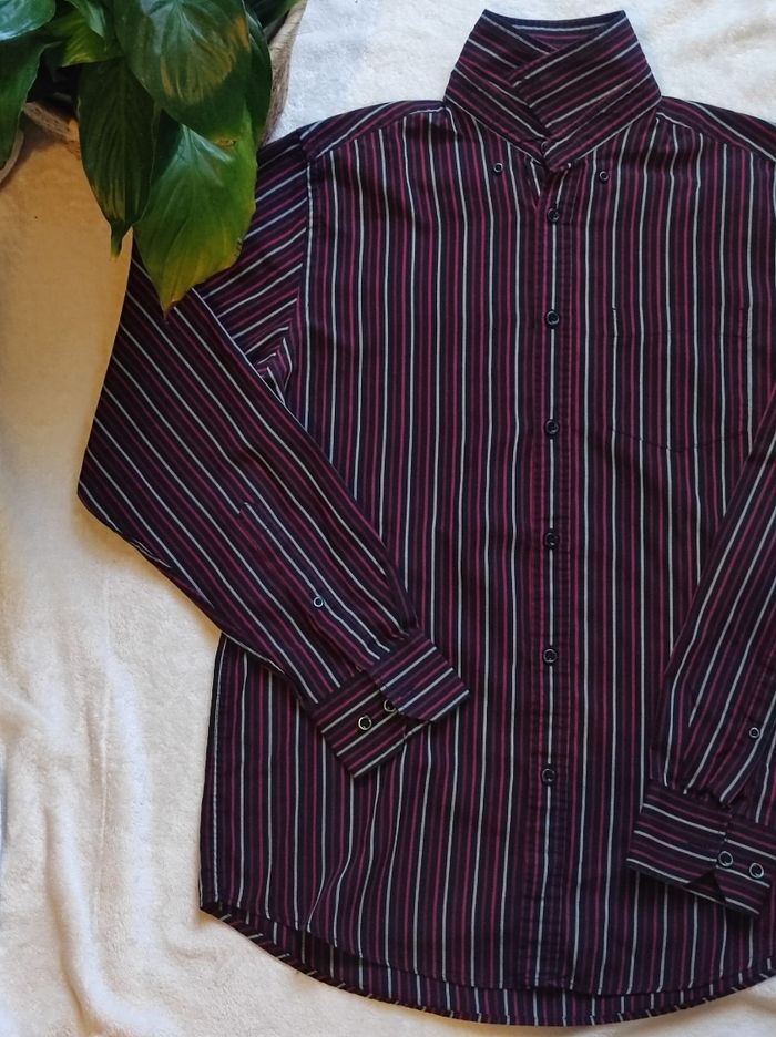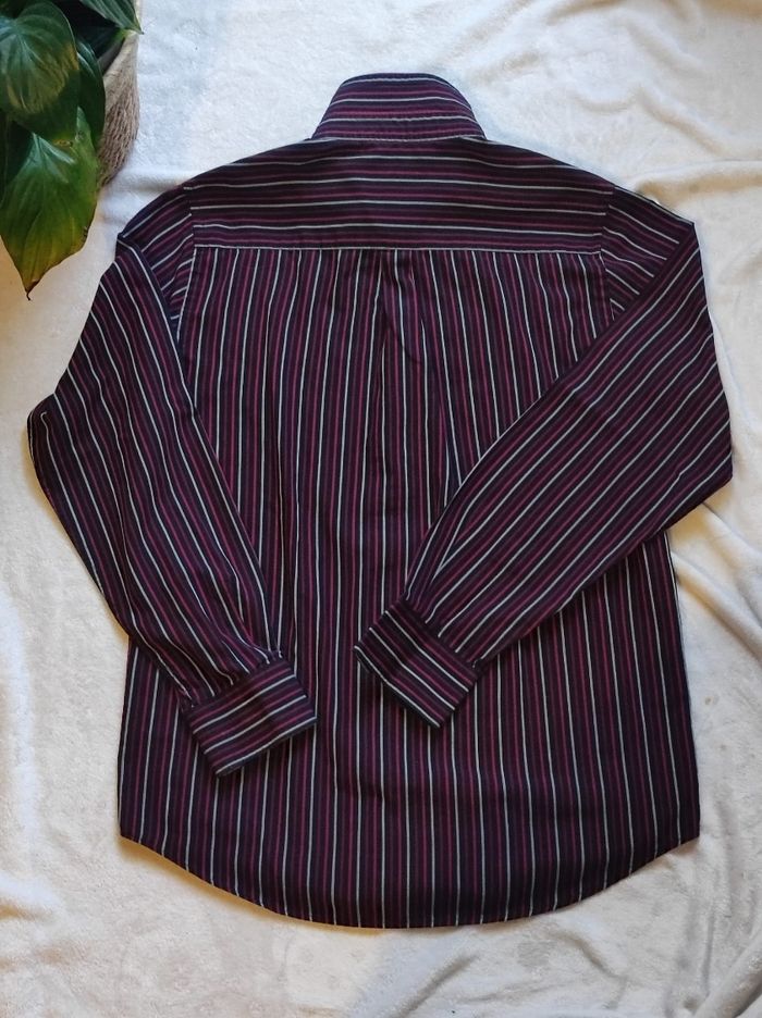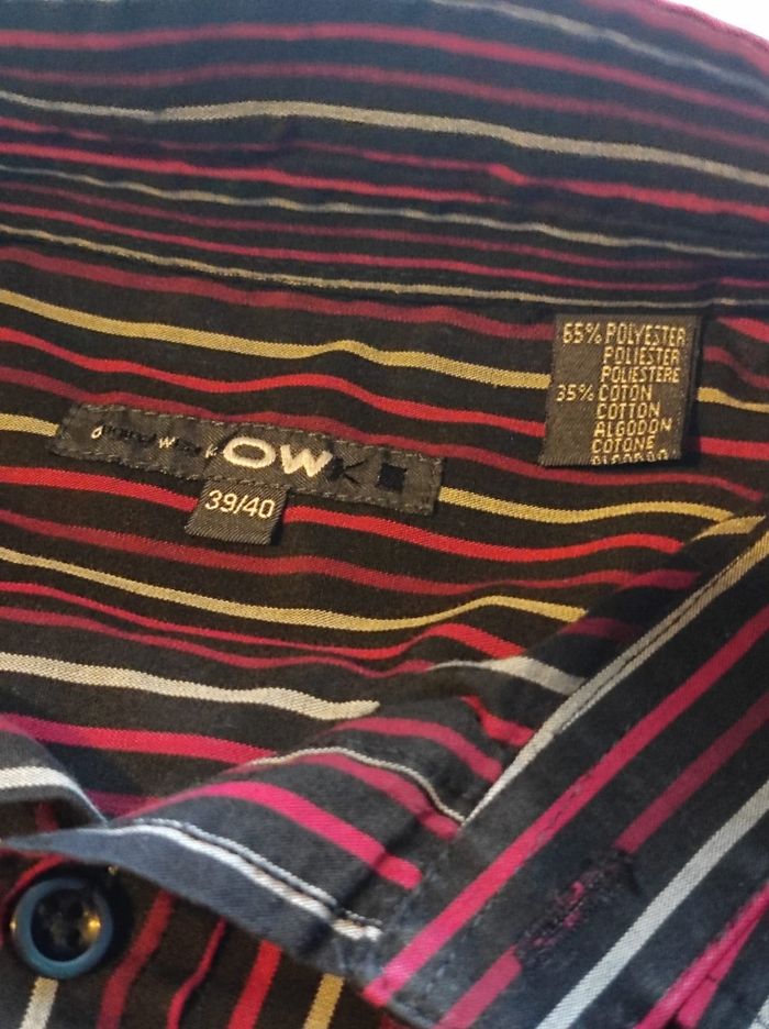 chemise rayée ( rose/violet/gris) sur fond noir de la marque OWK ( original wear k ) affiché taille 39/40. 65% polyester et 35% coton. Boutons sous le col pour un bon maintien. Petite poche sur le côté gauche. À manches longues. Léger et agréable à porter. Très peu porter, ni trous tâches ou déchirures. En parfait état.