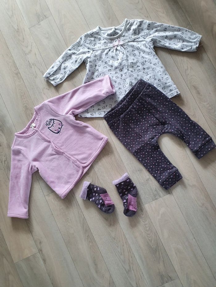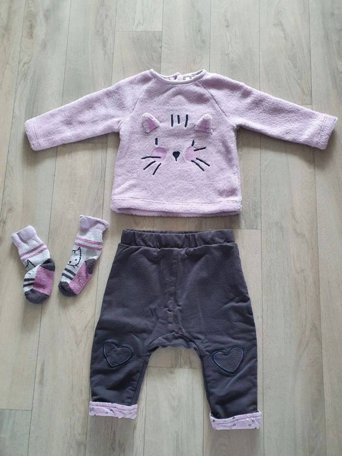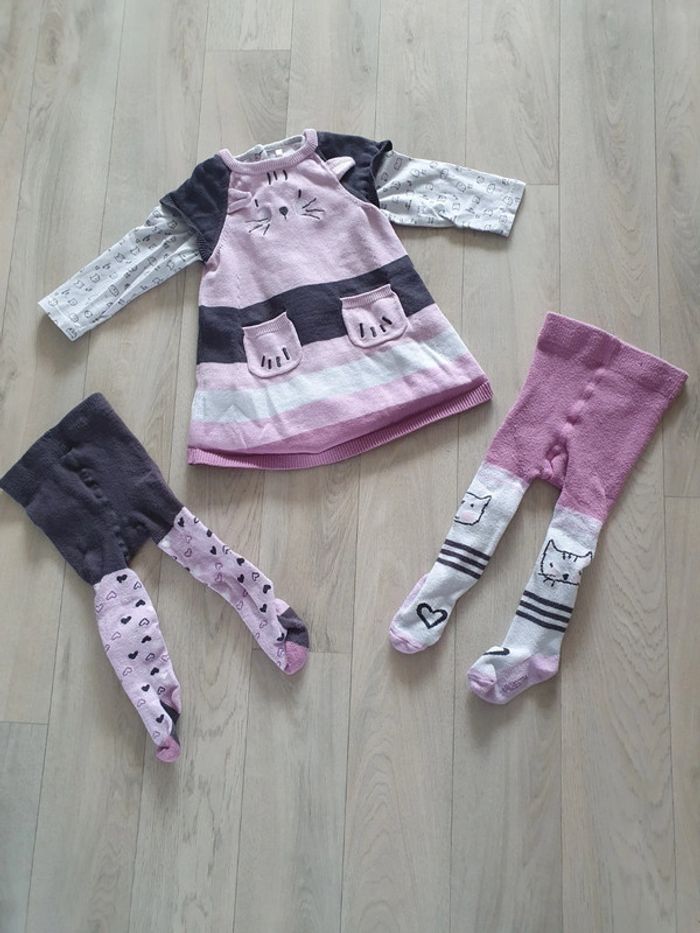Jolis ensembles de la marque Orchestra, tout du même thème se composant d'une robe, d'un t-shirt, de 2 paires de collant (je donne, bouloché mais pas troué), d'un gilet, d'une tunique, d'un legging, de 2 paires de chaussettes (je donne, bouloché mais pas trouée), d'un gilet, d'un bonnet, d'un pull moumoute et d'un sarouel. Porté mais en très bon état, le legging légèrement bouloché. Taille 6 mois #locita856moisfille