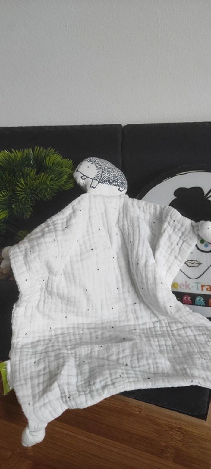 Doudou Hérisson lange coton blanc pois points noirs Feuilles Vertes Vertbaudet noeuds - photo numéro 1