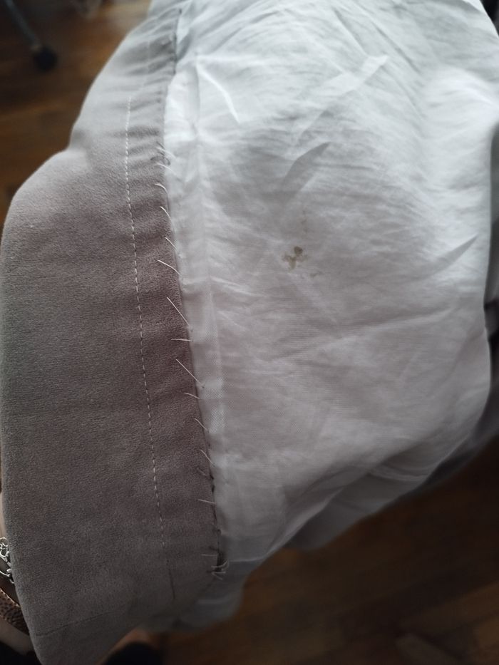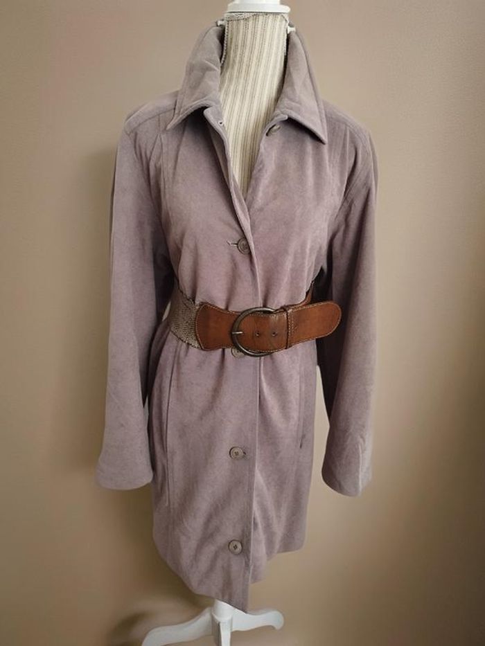Jolie veste Taille non précisée (je dirais 40/42) Épaules 42 cm Longueur 92 cm Taille 58 cm Manches longues, poches latérales Marque Non précisée Un bord a été fait dans le bas, mais ça peut être retiré (Concernant la couleur, je dirais un mauve-gris souris) Vendu sans la ceinture Un petite tâche en bas de la doublure intérieure