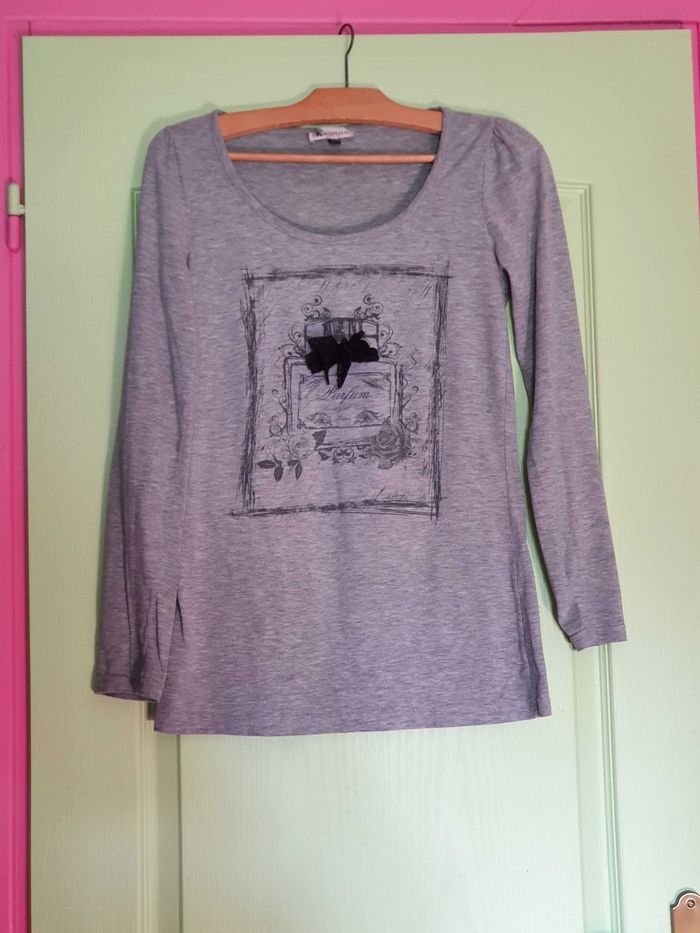 T shirt manche longue femme avec motif et petit nœud taille 38/40 Marque K.Woman Porté quelques fois. Pas de trou ou de tâches. Très bon état général