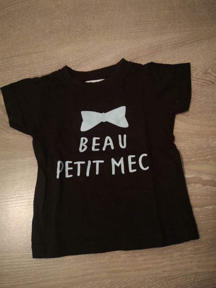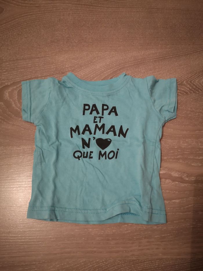 Lot de 3 t-shirts MC 6 mois - 2 Barbouillage - 1 Kimadi Très bon état J'ai d'autre vêtements, n'hésitez pas à regarder mon profil pour faire un plus gros lot :) (prix de lot possible)