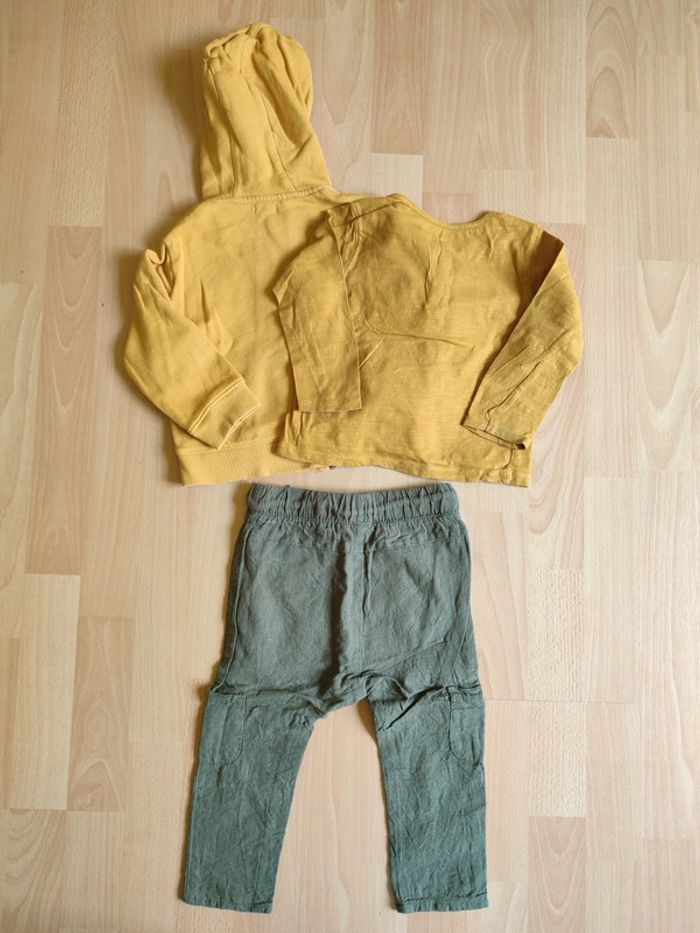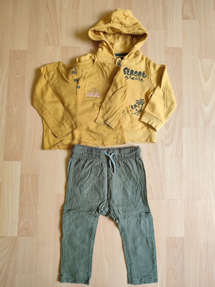Lot pantalon sarouel+ sweat zippé à capuche Kiabi + t-shirt manches longues Pat & Ripaton en 24M - photo numéro 1