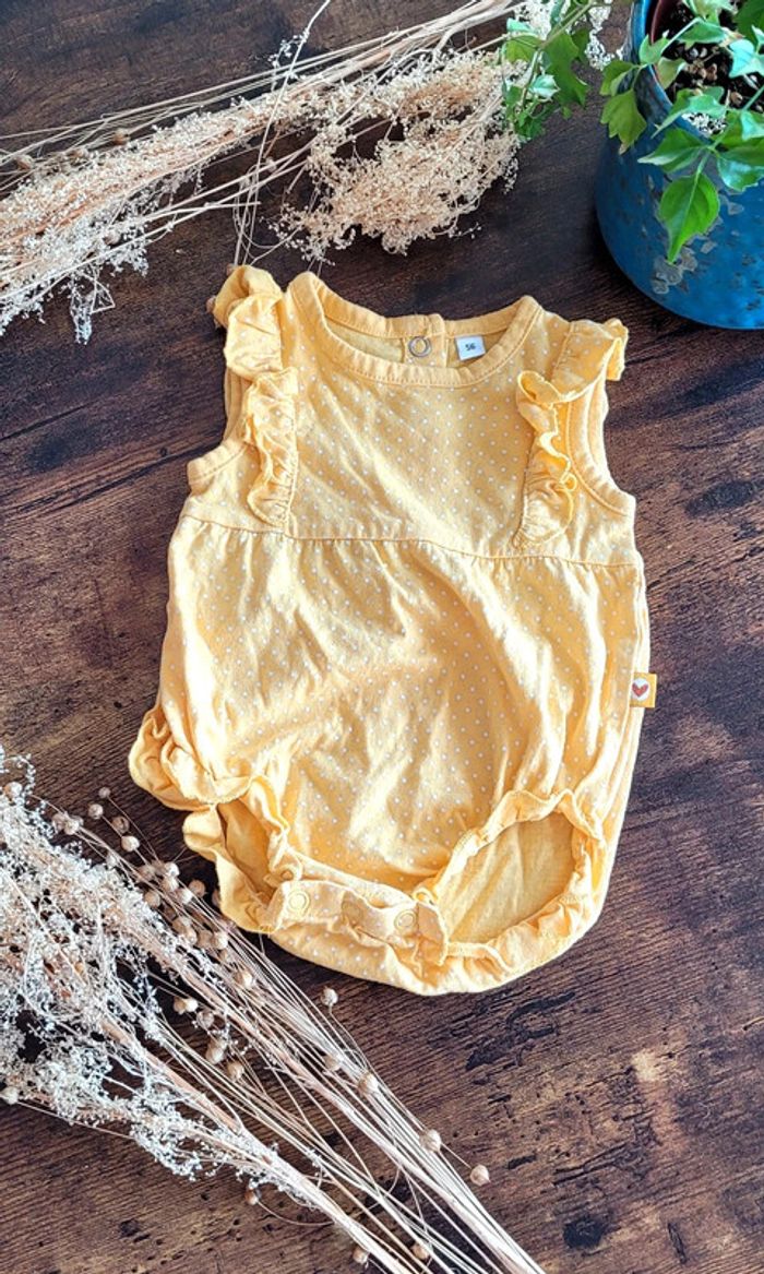 Body robe/salopette jaune à pois blanc Kiabi 1mois comme neuve portée une seule fois. Maison non fumeur et sans animaux Envoi rapide et soigné