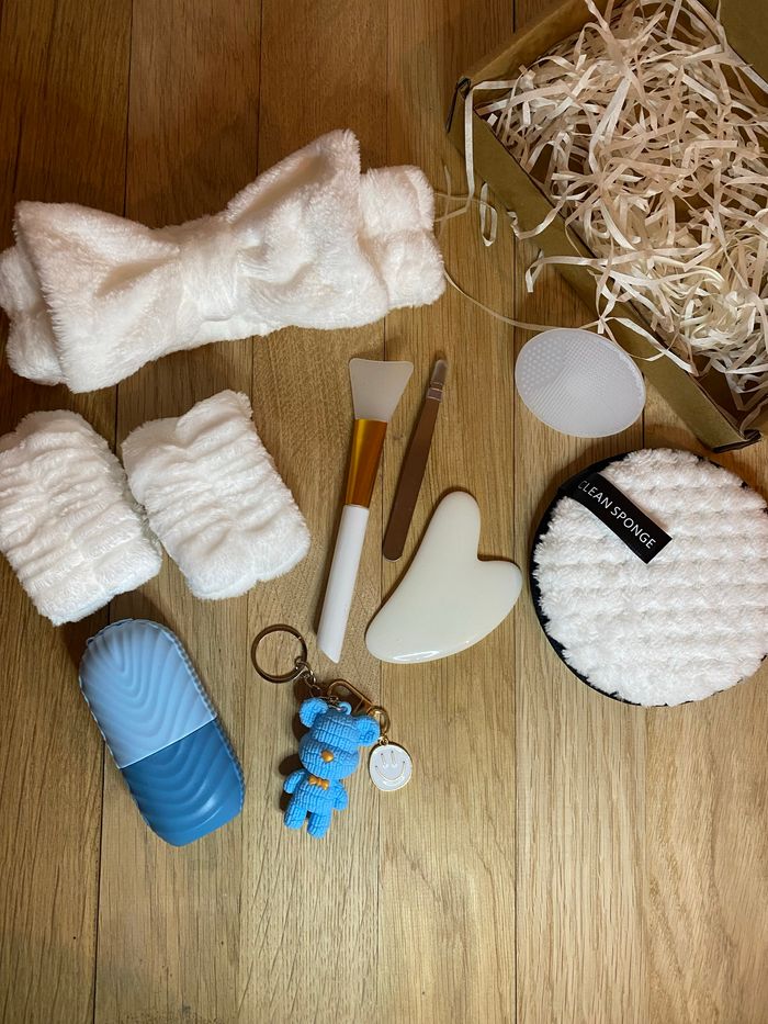 Box composée de 10 accessoires skincare : - bandeau pour cheveux - bandeaux de poignets - brosse nettoyante visage - pinceau pour appliquer son masque - pince à épiler - guacha - coton démaquillant réutilisable - rouleau de glace - porte clé nounours - porte clé sourire #beauty