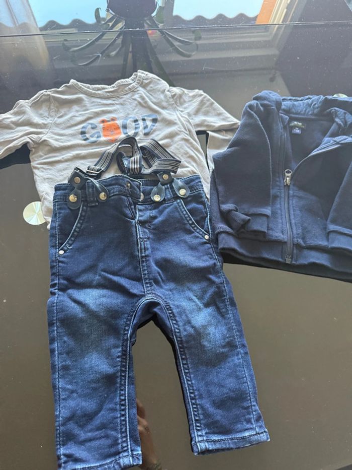 Un teeshirt manches longues orchestra Un pantalon jean à bretelles orchestra Une veste super bleu marine Kiabi Le tout en 9 mois état impeccable