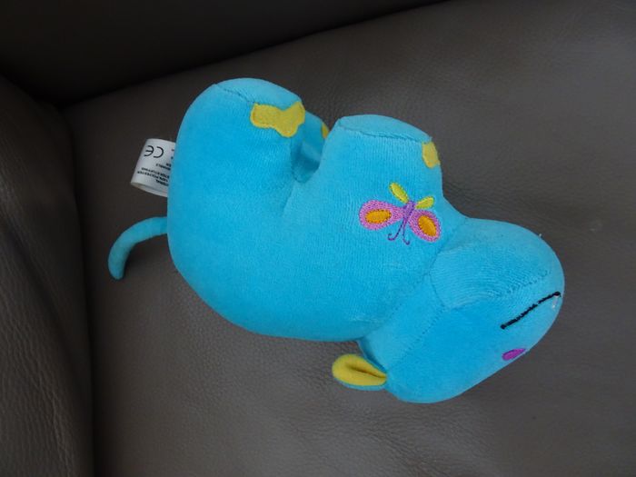 Doudou hippopotame bleu qui fait du bruit quand on le secoue. Norme CE.