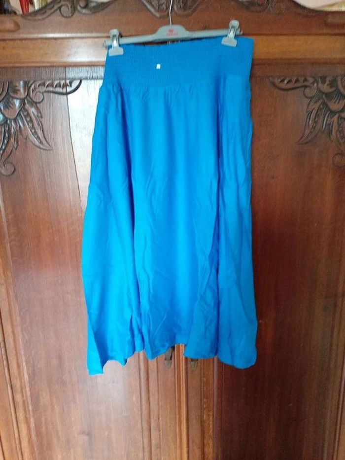 Jupe longue et fluide neuve, jamais portée. Coupe évasée pour un bel effet dansant. Ceinture élastiquée et smockée. Deux poches sur les côtés. Longueur : 85 cm environ Coloris : bleu Taille : 52 100 % polyester Achetée 40 €