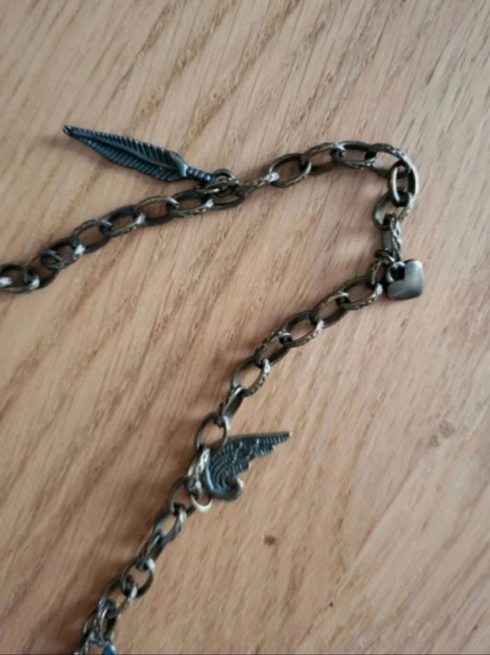 . Collier composé d'une chaîne à grosse maille couleur métal vieilli et de 7 petites breloques : étoile, cage, main, aile, cœur, plume et perle . Très bon état, sans défaut, peu porté . À enfiler, il n'y a pas de fermoir . Longueur totale : 77 cm 🌸 Et si vous alliez faire un tour dans mon dressing ? Les réductions sur les lots sont activées 🩷 Fantaisie Baroque