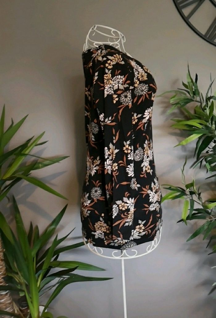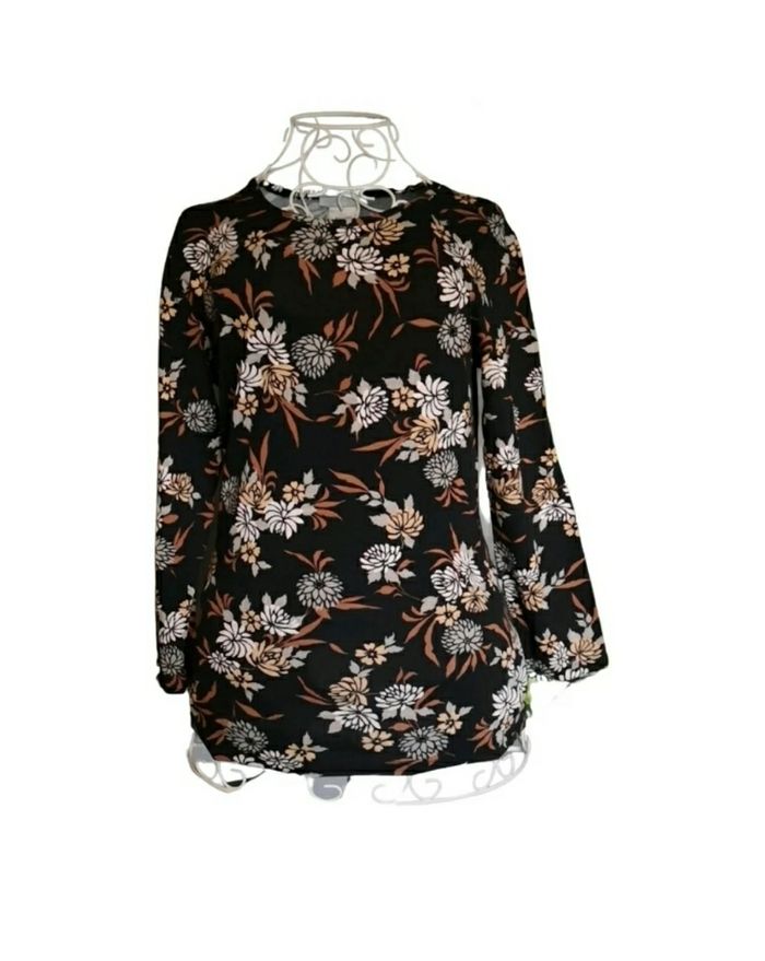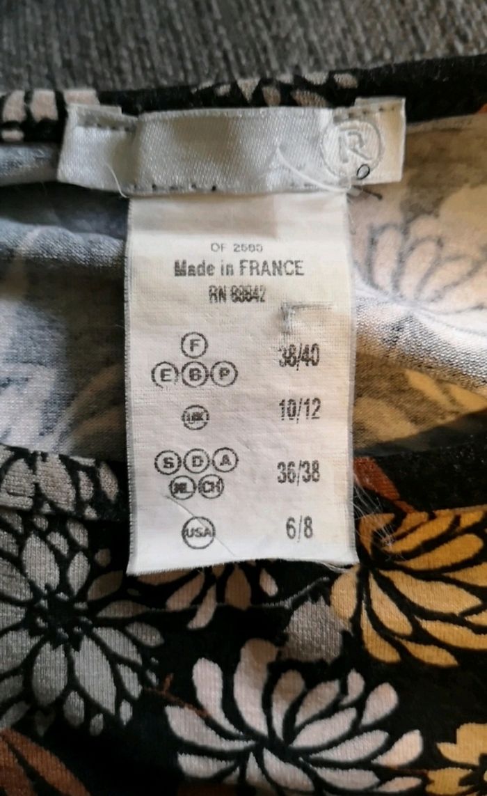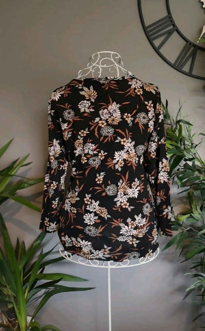 T shirt avec des fleurs, manches 3/4 Fait en France. Marque René Hazan. Taille 38/40 Couleur noir et marron En parfait état