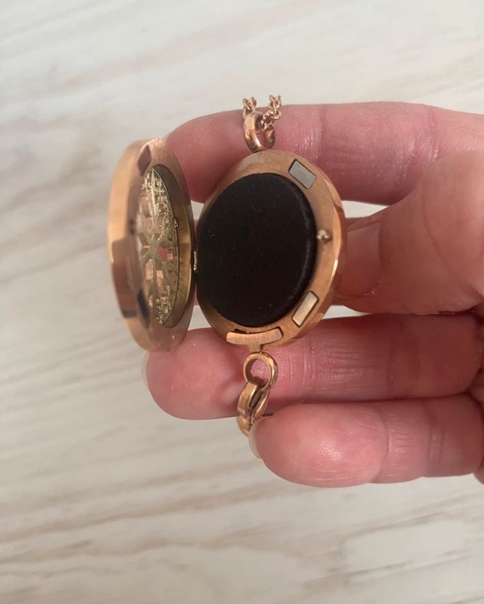 Collier pendentif diffuseur de parfum en parfait état Jamais porté La partie basse se détache Plusieurs recharges fournies