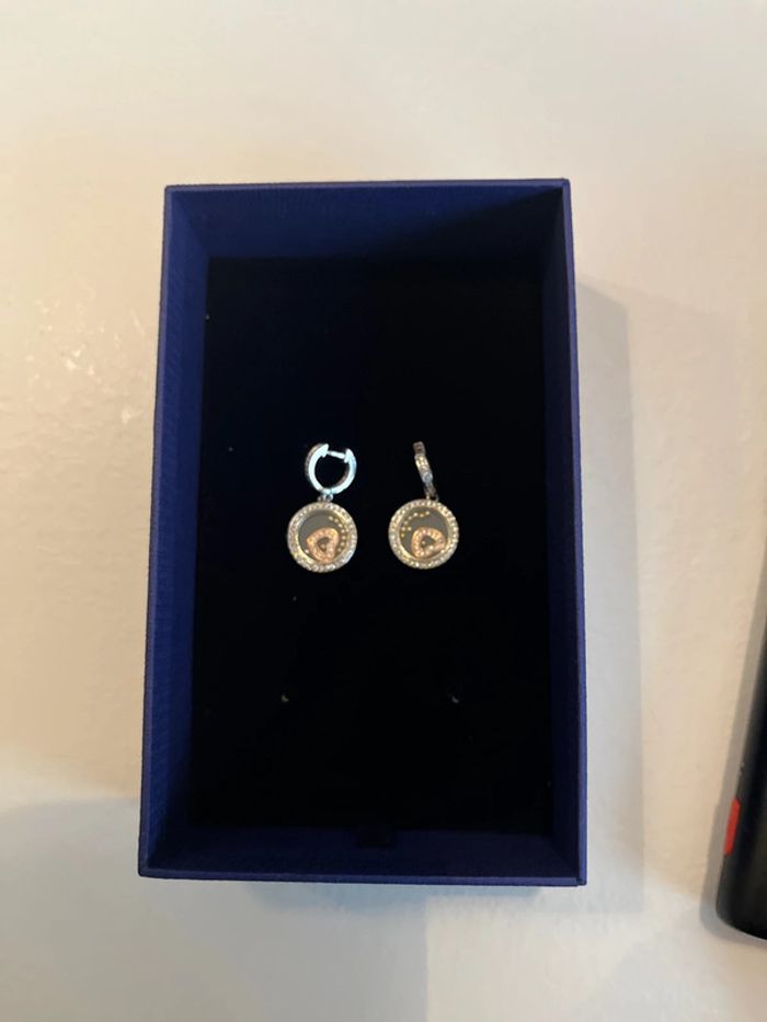 Boucle d’oreille légèrement pendantes avec cœur flottant au milieu et strass sur le dessus en très bon état portées une ou deux fois