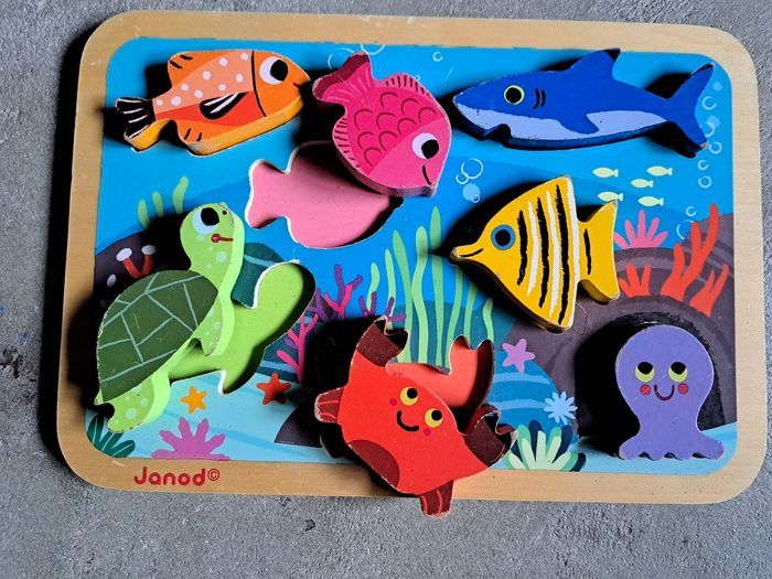 Puzzle en bois pour découvrir les animaux marins ! Pièces en 3D, épaisses de 1,5 cm, pour faciliter la prise en main des plus petits. Développement de la motricité et imagination L'enfant pourra positionner les pièces à la bonne place et jouer avec elles comme de vraies figurines, car elles tiennent debout. Certaines pièces sont un peu abîmé mais cela n'empêche en rien à l'enfant de jouer et surtout il peut y jouer en toute tranquillité (aucun risque d'étouffement) Prix neuf : 24 €