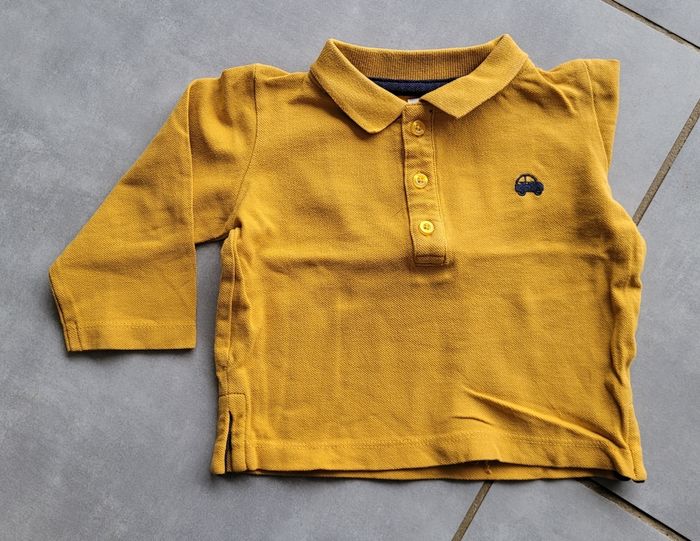 Polo manches longues, de coulisses orangé avec petite voiture brodée, de la marque Mots d'enfants, taille 18 mois, en très bon état. Article lavé pour la vente.