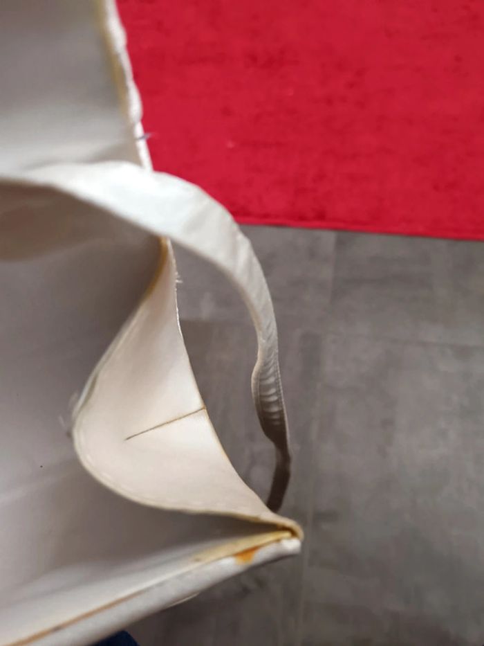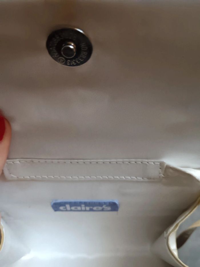 Pochette de soirée satinée avec lanière. Blanc crème. Légèrement jaunie à l'intérieur. Marque Claire's. #accessoiresfemme #pochettesoirée