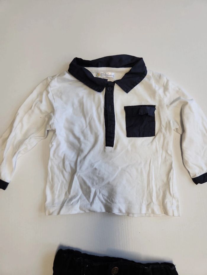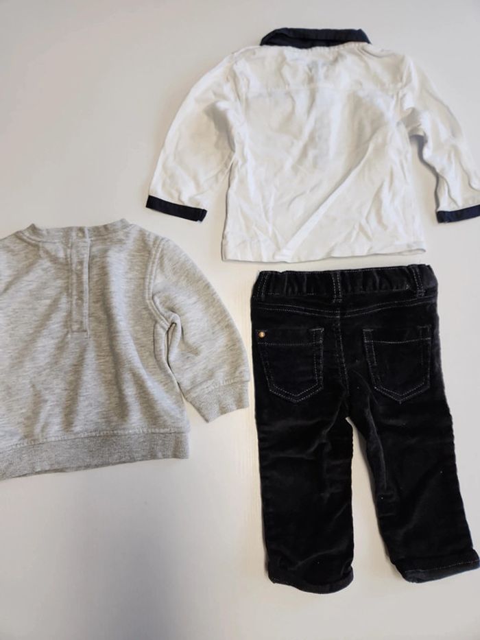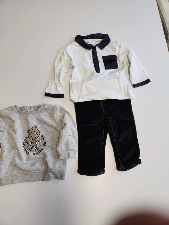 Ensemble enfant 3 pièces avec 1 t-shirt manche longues kitchoun, 1 jeans velours inextenso et 1 pull kiabi en très très bon état 12 mois 74cm