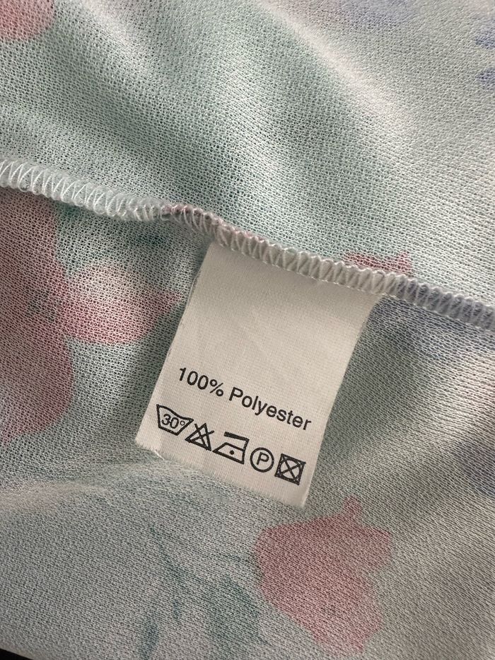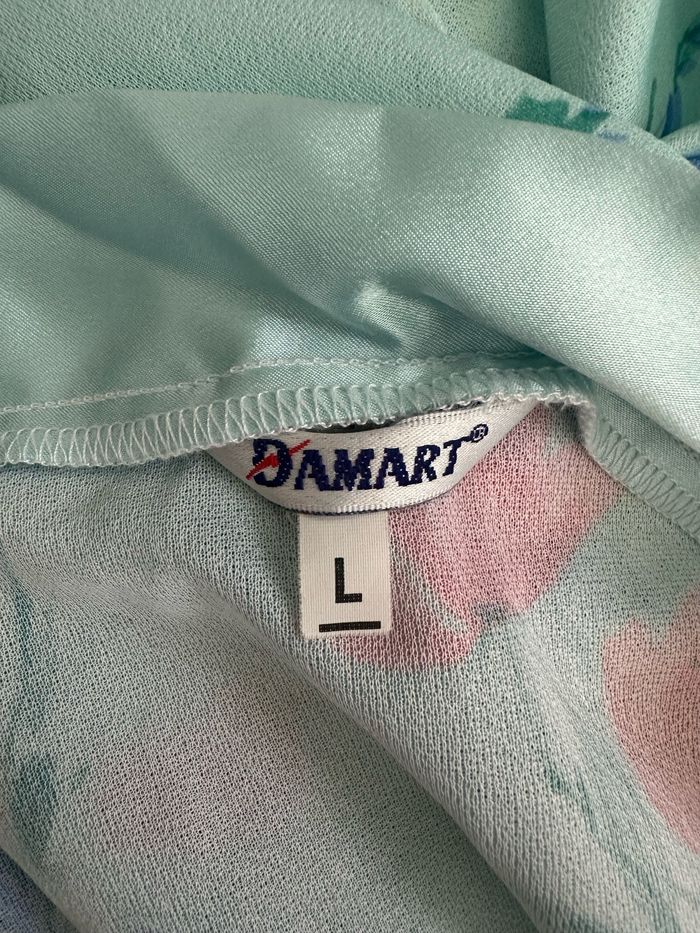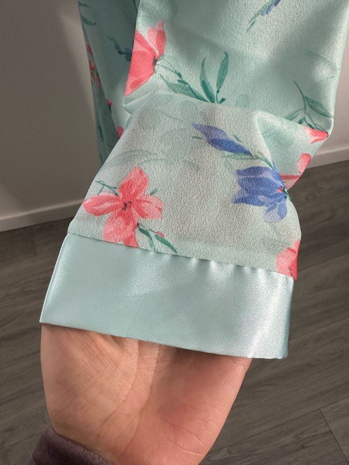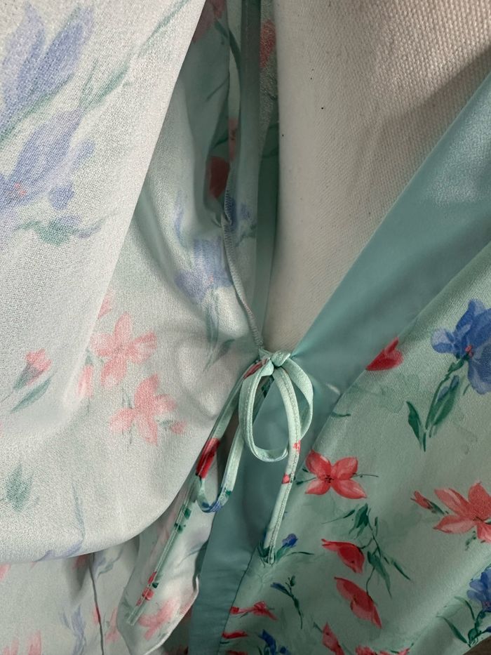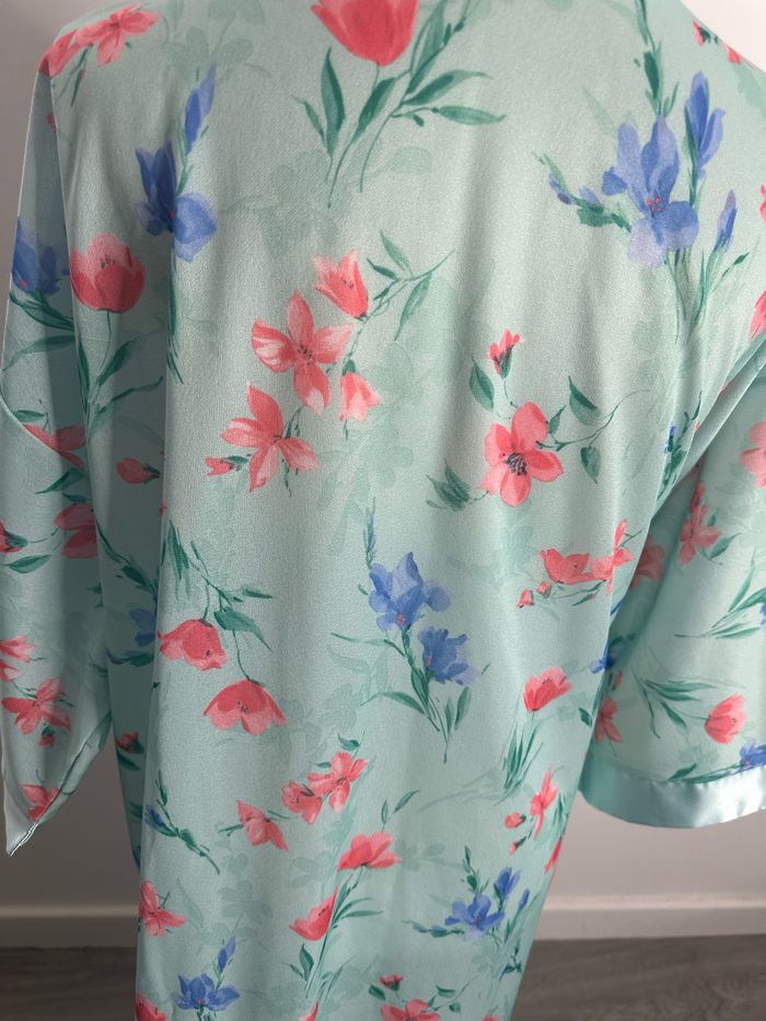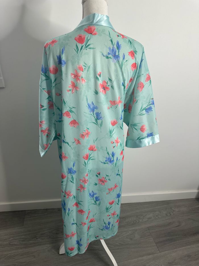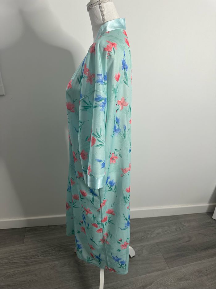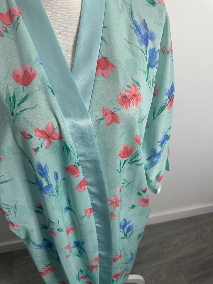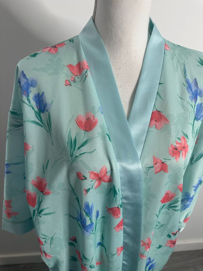 Peignoir kimono long - Excellent état - Taille 40 équivalent L - Marque Damart - Imprimés fleurs - Vert menthe, bleu et rose - Liseré satiné au niveau du col et des manches - Liens à nouer à l’intérieur pour l’attacher - 100% Polyester Dimensions: - 66cm niveau aisselles - 109cm de long