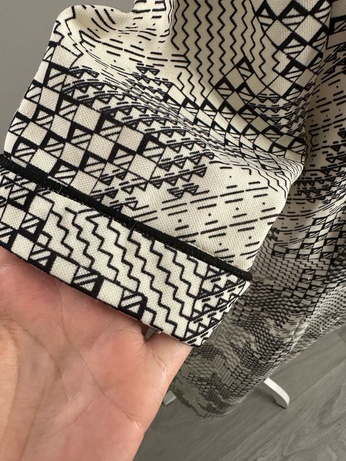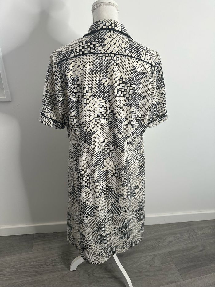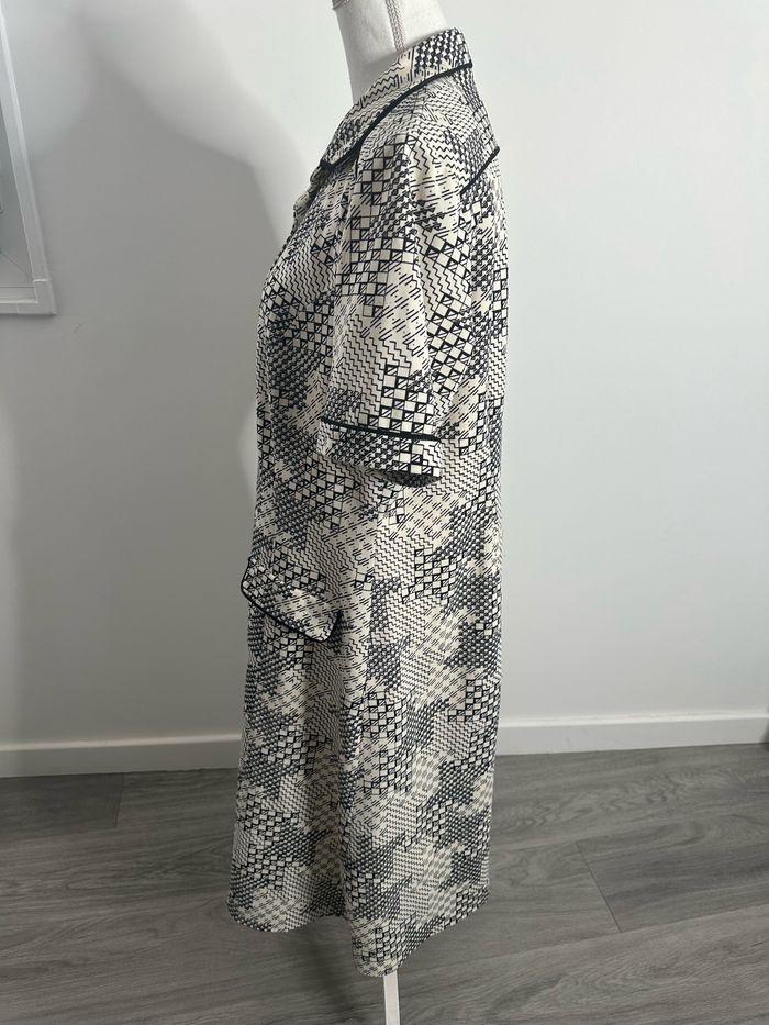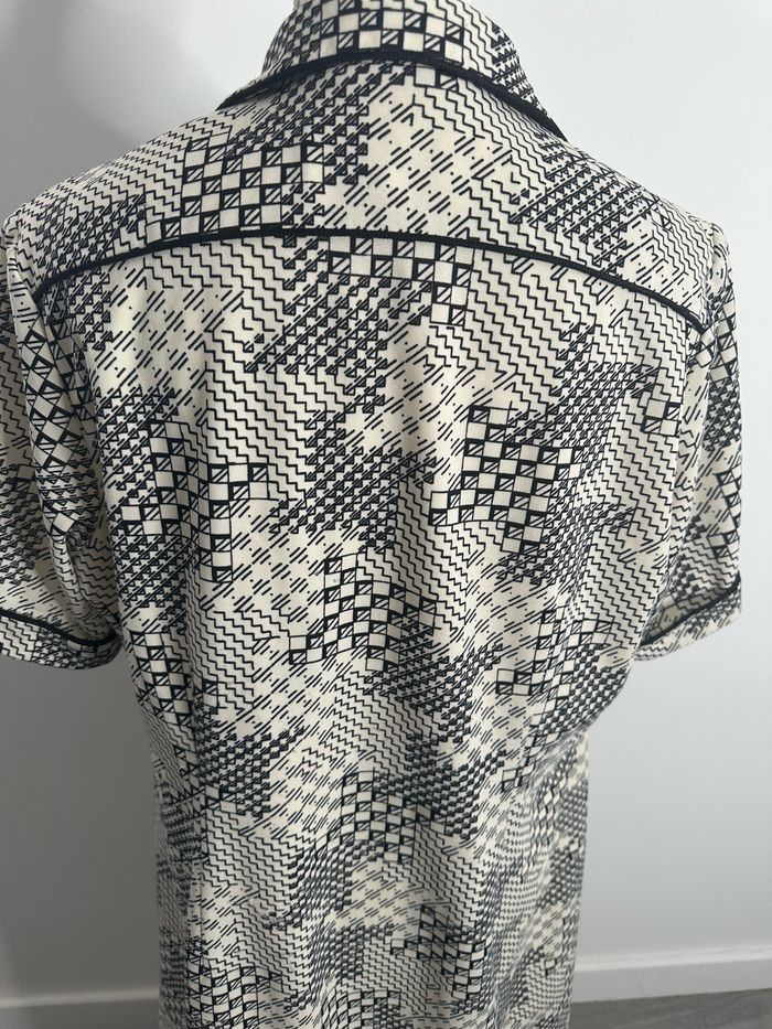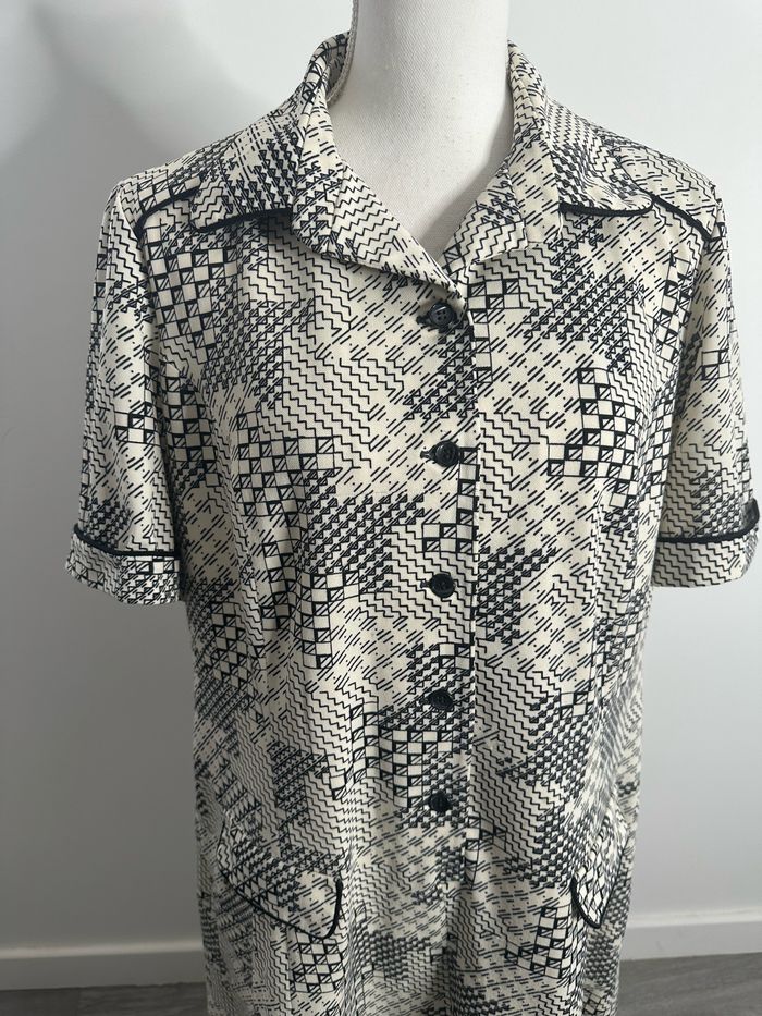 Robe - Excellent état - Taille 44 équivalent XXL - Beige crème et noire - Vintage, années 80’ - Se ferme avec des boutons à l’avant - Manches courtes - Imprimés géométriques damiers - Doublure intérieure - Style cartoon pop art - Pas d’étiquette de taille ni de matière Dimensions: - 43cm niveau épaules - 58cm niveau aisselles - 105cm de long