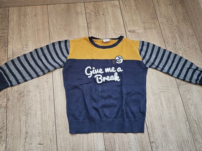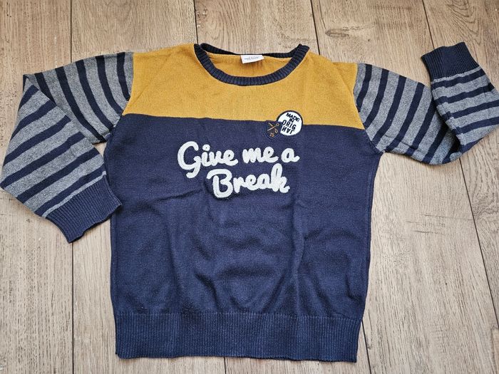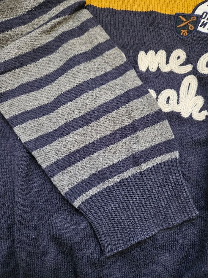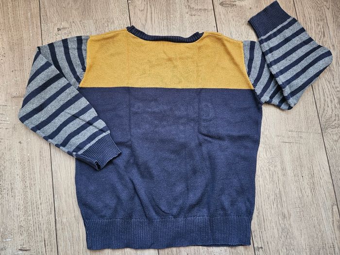 Pull col rond bleu marine et moutarde Tape à l'oeil 4 ans Manches rayées bleu marine et gris Bon état #flagadajones4ans #pull4ans #tao4ans #tapealoeil4ans #pulltao4ans