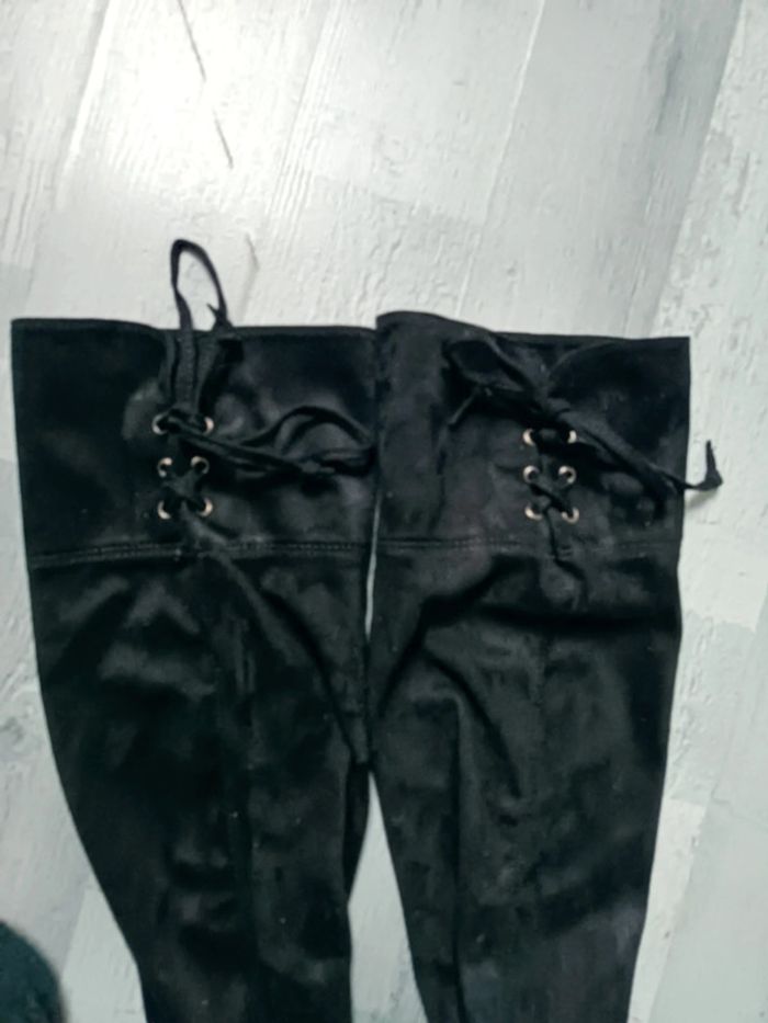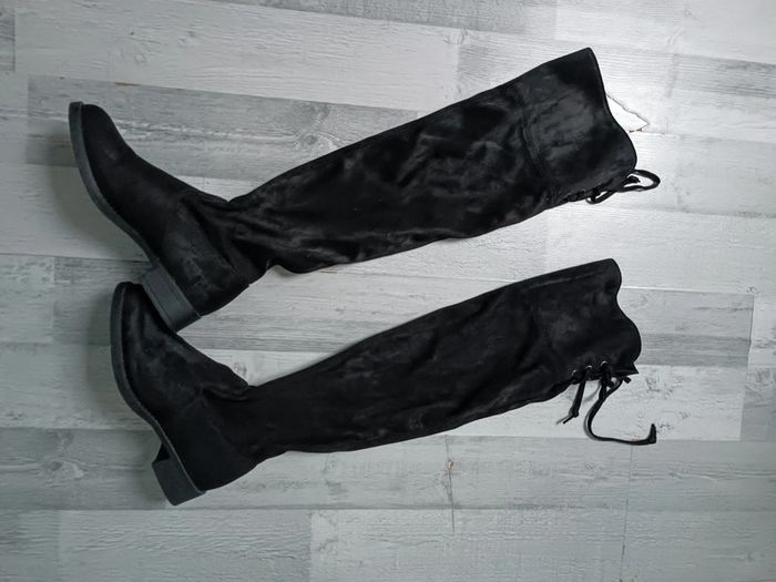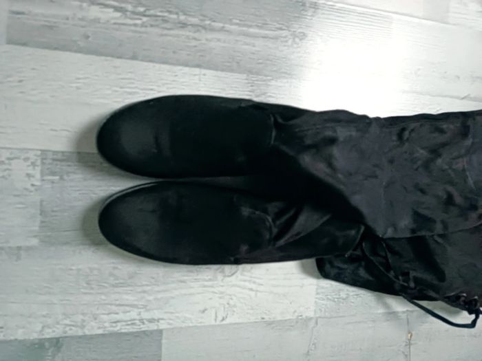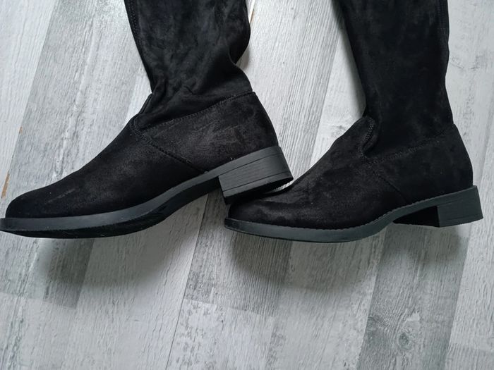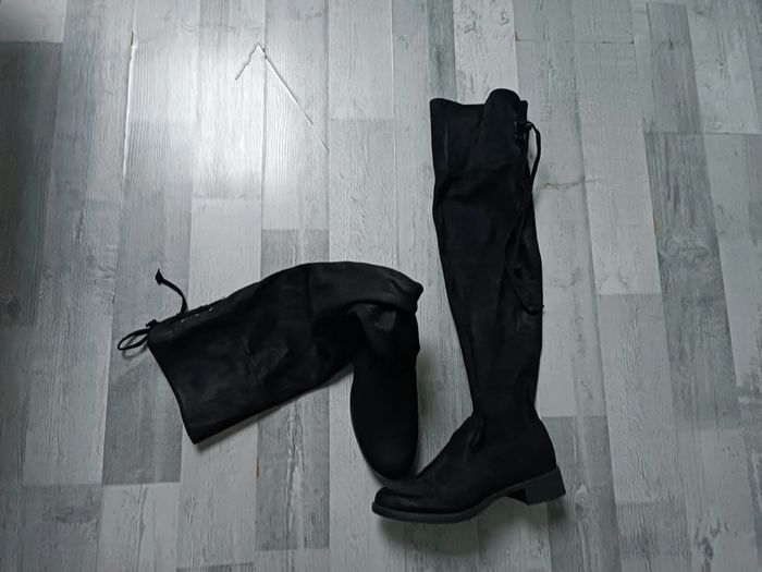 Cuissardes aspect suédé,souples taille 37 mise 2h je ne les mets plus,elles sont nickels car quasi pas marché avec c'était pour un repas! Achetées 59,99 euros