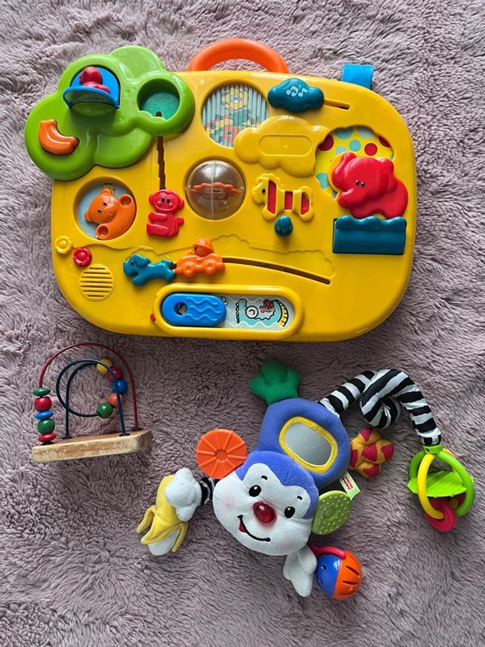 * table d activité Peut s accrocher. Jouet à piles mais ne fonctionne pas pour le son ( manque cache piles) Taille 40 cm/ 30cm * boulier ( quelques rayures sur le socle) * petit singe ( le son ne fonctionne pas mais à vérifier avec des piles )