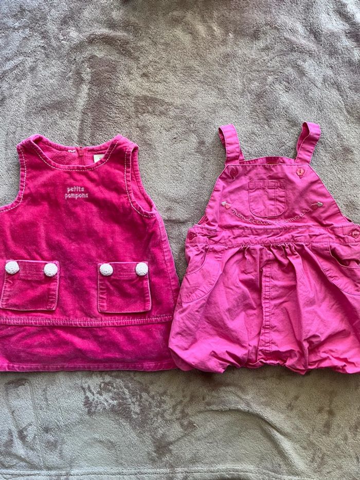 Bonjour vend 2 robes en très bon état 1 avec bretelles et 1 avec fermeture éclaire dans le dos. 6 mois